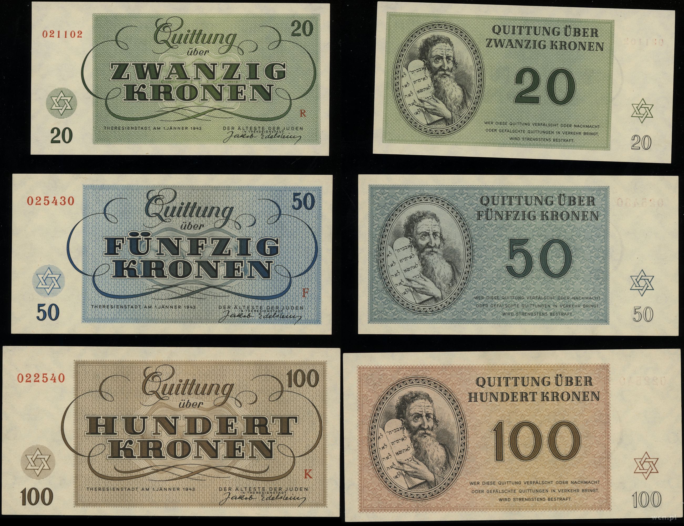 | Opis: | getto Teresin w Czechach, zestaw: 1, 2, 5, 10, 20, 50 i 100 koron 1.01.1943, razem 7 pięknych egzemplarzy, Campbell 4111-4117 |
