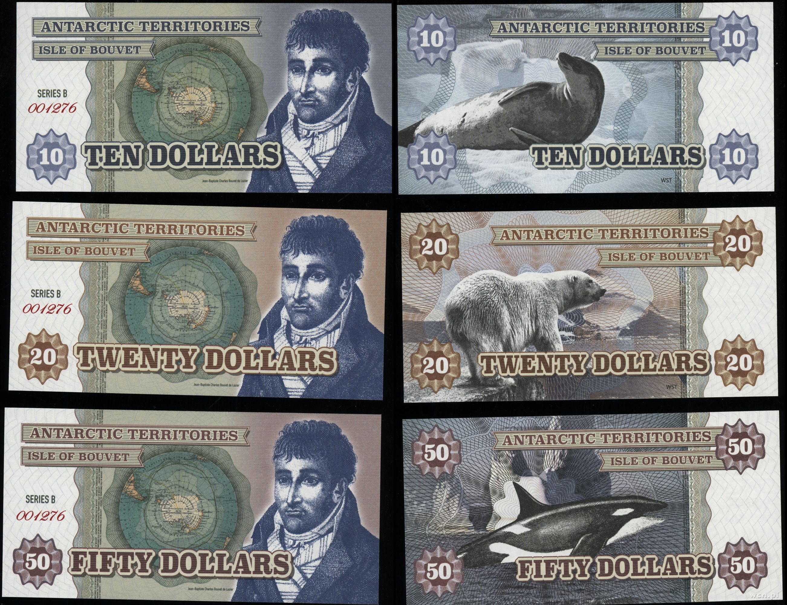 | Opis: | Antarktyda, zestaw 6 banknotów, w skład zestawu wchodzi 1, 2, 5, 10, 20, 50 dolarów, razem 6 pięknych sztuk |