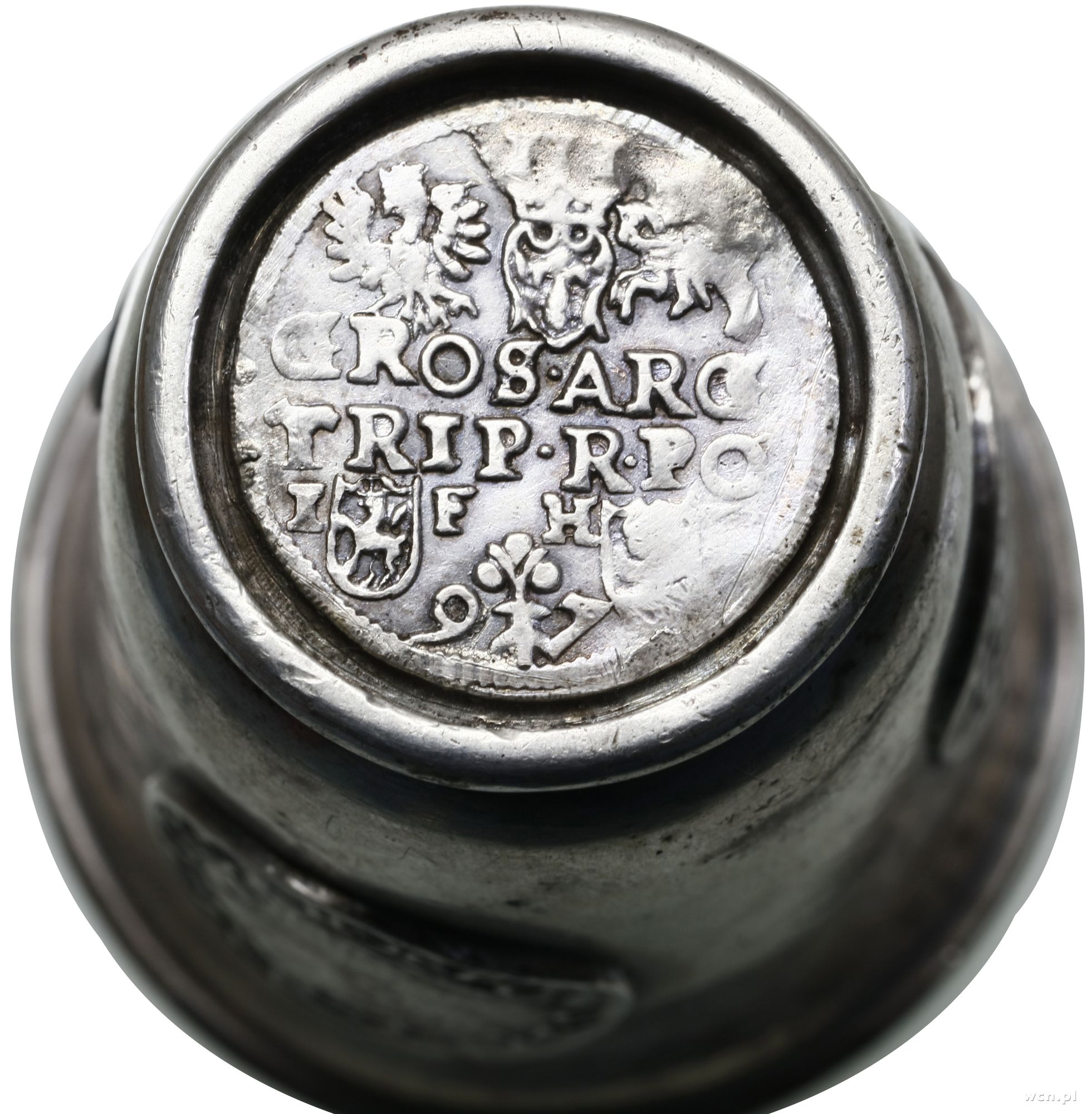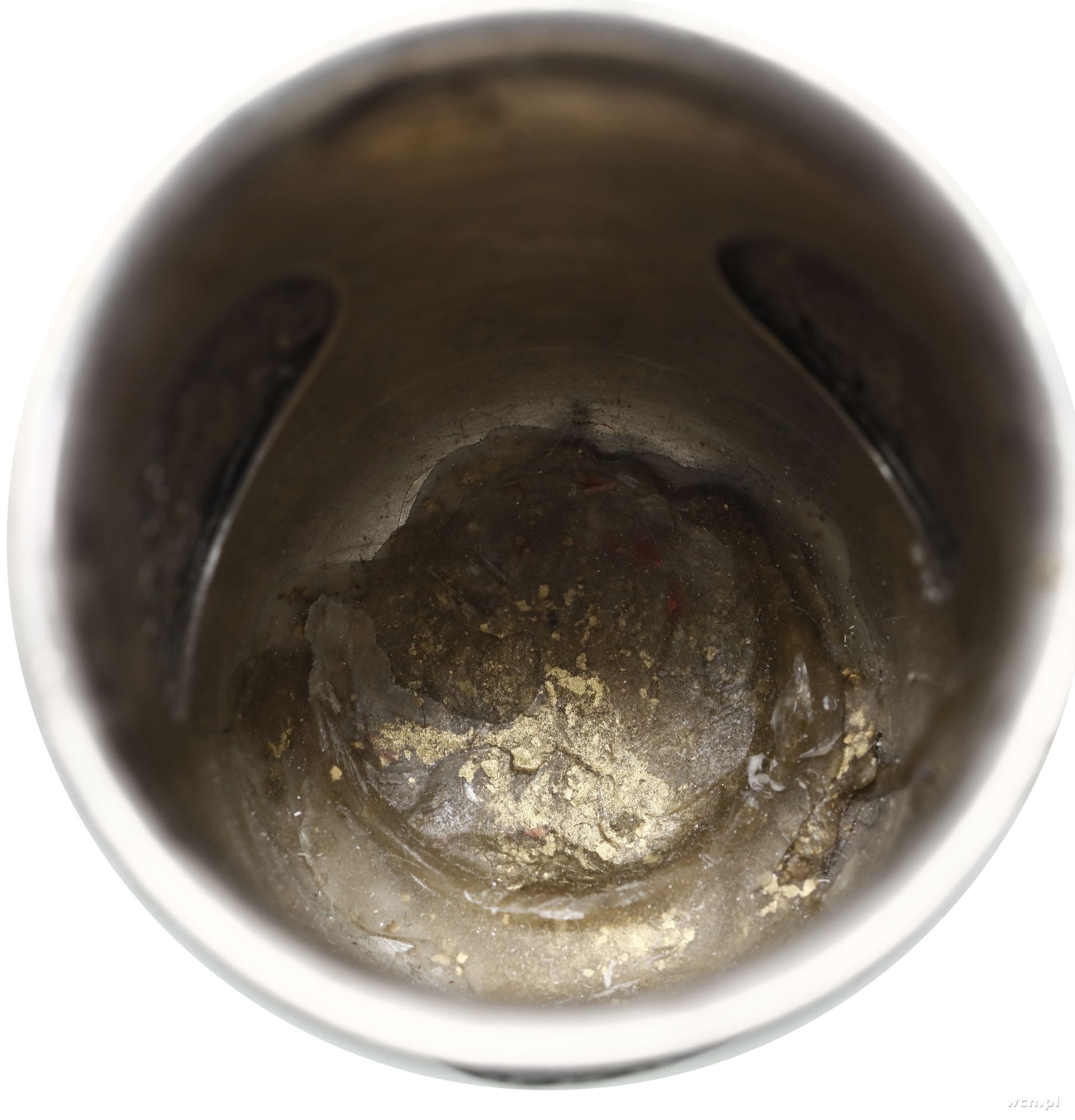kielich srebrny z monetami w korpus wlutowane monety o nominale trojaka: 1583