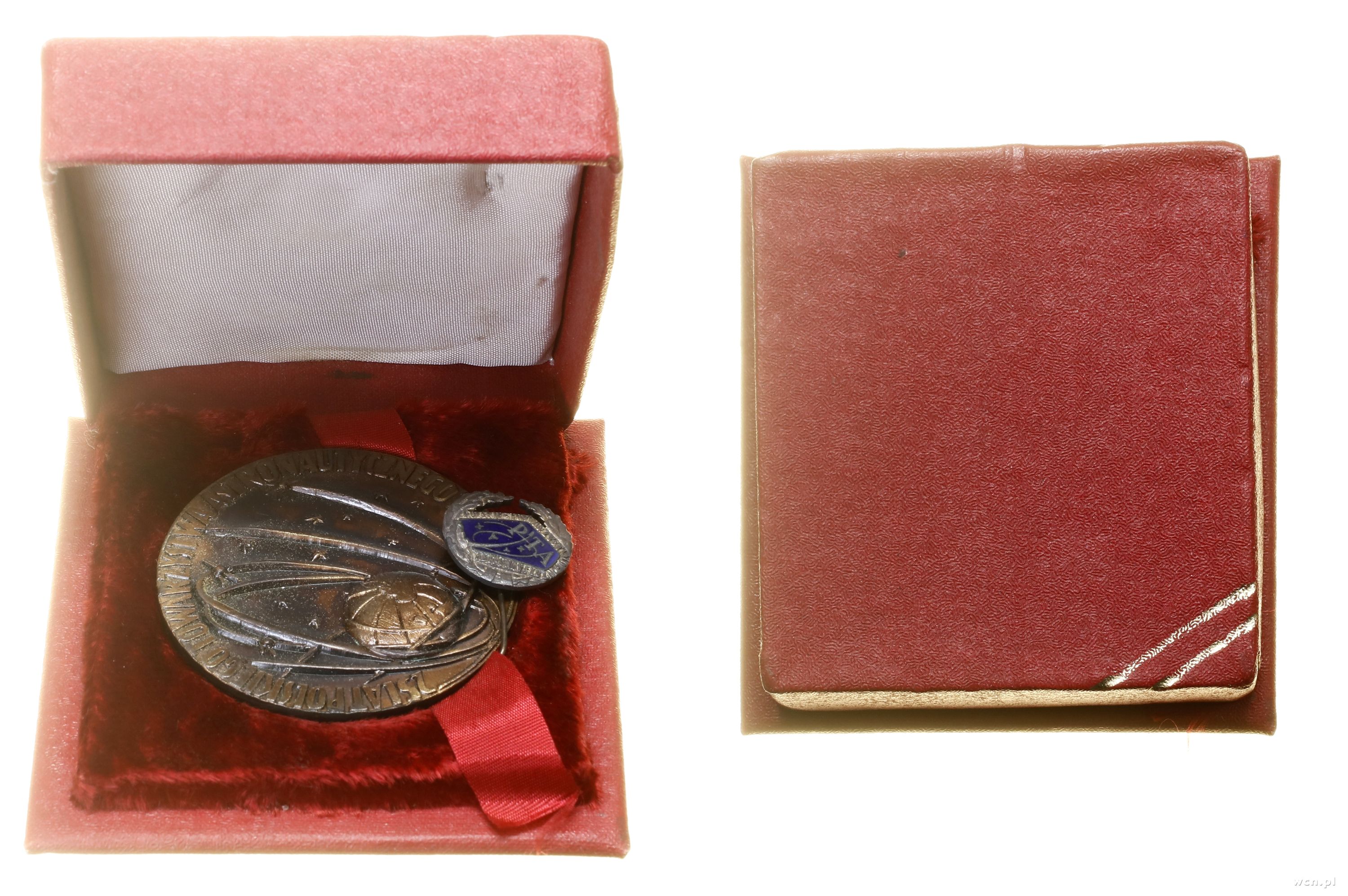 | Opis: | Polska, Polska Rzeczpospolita Ludowa (1952–1989), 25 lat Polskiego Towarzystwa Astronautycznego 1980, Aw: Ziemia na tle gwiazd z zaznaczonymi orbitami, 25 LAT POLSKIEGO TOWARZYSTWA ASTRONAUTYCZNEGO 1955•1980, Rw: Ziemia na tle słońca i innych planet z zaznaczonymi orbitami, PIERWSZY POLSKI KOSMONAUTA MIROSŁAW HERMASZEWSKI • 27 • 6 - 5 • 7 • 1978, dodatkowo wpinka Polskiego Towarzystwa Astronautycznego i legitymacja Honorowej Odznaki Polskiego Towarzystwa Astronautycznego wystawiona na nazwiski Prywałow Włodzimierz, miedź, 55.9 mm, 103.78 g, dodatkowo eleganckie pudełko |