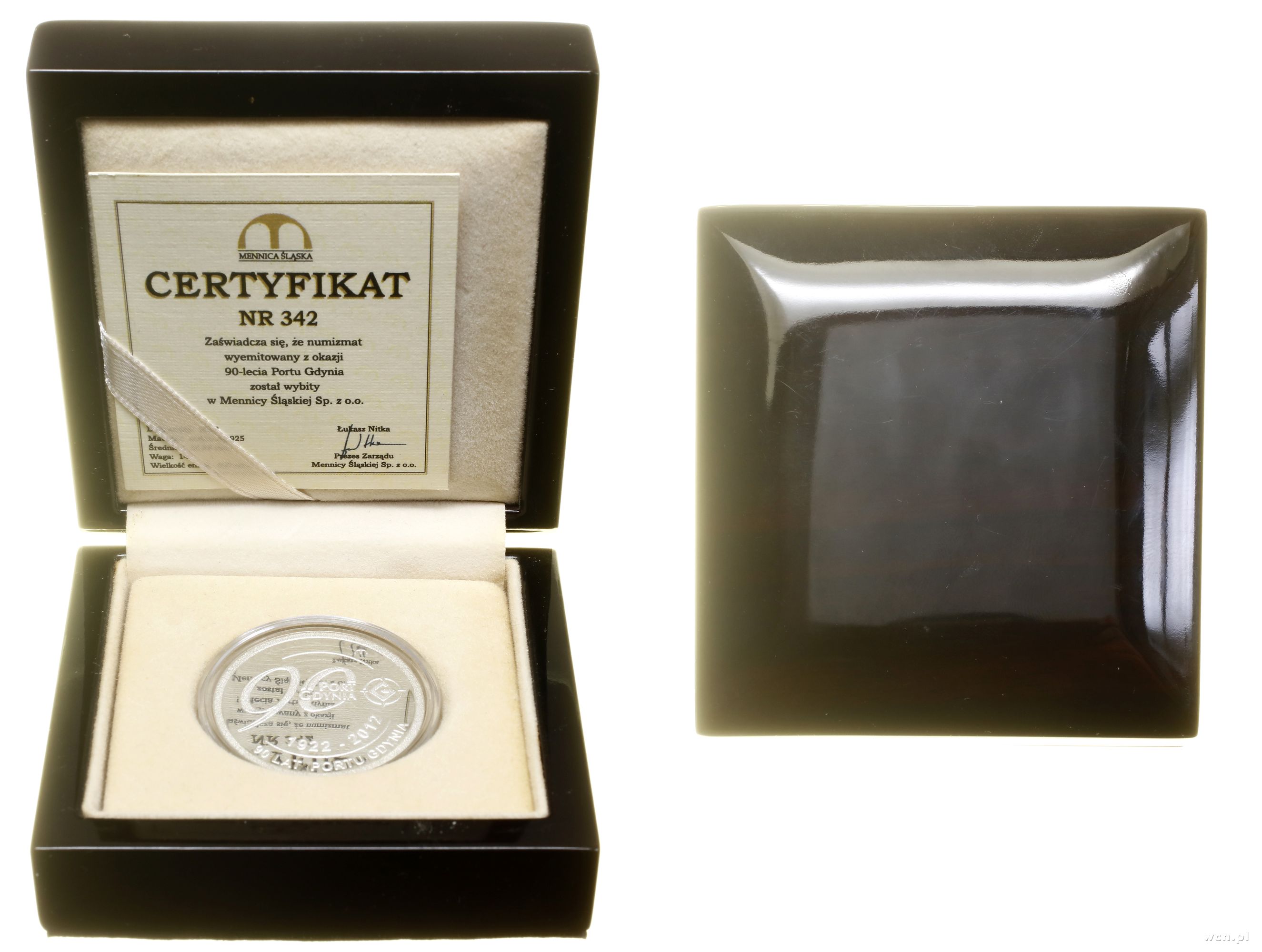 | Opis: | Polska, III Rzeczpospolita Polska (od 1989), 90 lat Portu Gdynia 2012, Aw: 90, w cyfrze 0 PORT / GDYNIA, po prawej logo Portu Gdynia, na dole 1922 - 2012 / 90 LAT PORTU GDYNIA, Rw: Plan Portu, po prawej logo Portu Gdynia, u góry ZARZĄD / MORSKIEGO PORTU / GDYNIA S.A., TRADYCJA I NOWOCZESNOŚĆ, srebro próby 925, 13.91 g, stemple lustrzane, moneta w plastikowym kapslu i eleganckim pudełku z certyfikatem nr 342 |