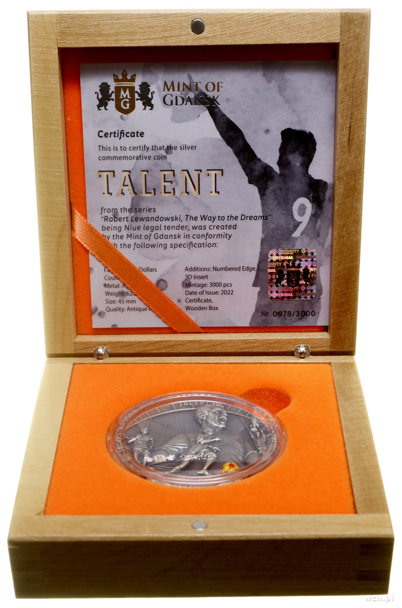 | Opis: | Niue, Elżbieta II (1952–2022), 5 dolarów 2022, Gdańsk, Robert Lewandowski – droga do marzeń, srebro próby 999, 63.52 g, nakład tylko 3.000 sztuk, moneta w drewnianym pudełku i certyfikatem nr. 0978, KM UC# 3564 |