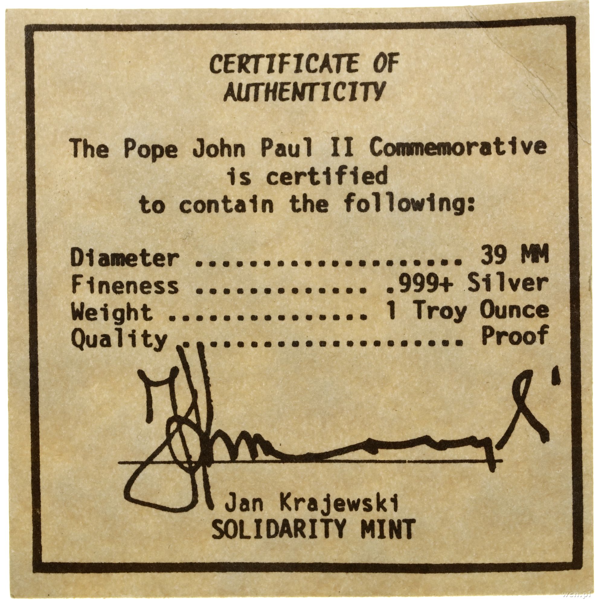 | Opis: | Polska, III Rzeczpospolita Polska (od 1989), Jasna Góra 1991, Aw: Popiersie Jana Pawła II w lewo, JASNA GÓRA 1991, Rw: Matka Boża Częstochowska, srebro 39 mm, wagi 1 uncji, medal w plastikowym opakowaniu, dodatkowo certyfikat, Nestorowicz 769, Grabowski – |