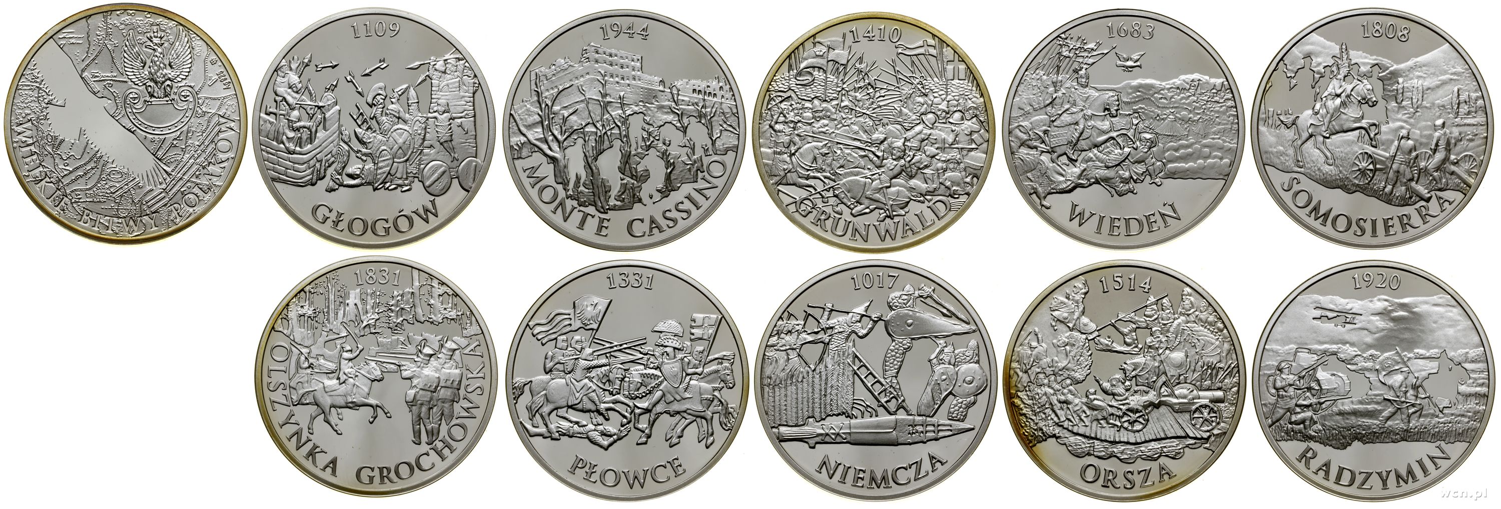 | Opis: | Polska, III Rzeczpospolita Polska (od 1989) - Mennica Warszawska, zestaw medali z serii Wielkie Bitwy Polaków, w zestawie: Niemcza 1017, Głogów 1109, Płowce 1331, Grunwald 1410, Orsza 1514, Wiedeń 1683, Somosierra 1808, Olszynka Grochowska 1831, Radzymin 1920 i Monte Cassino 1944, srebro próby 925, 10 x ok. 14 g, całość w pudełku Skarbca Mennicy Polskiej w formie kontura państwa Polskiego, dołączone certyfikaty, całość w oryginalnym pudełku |