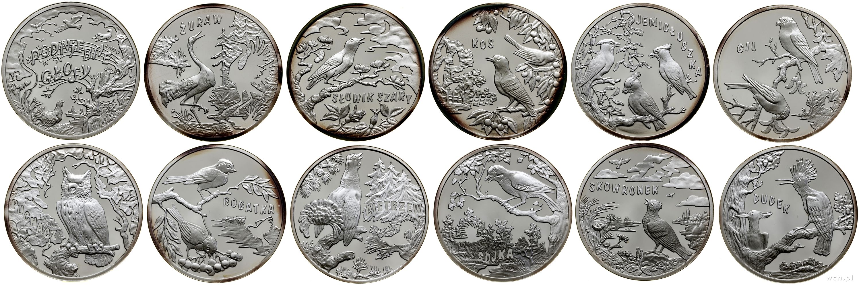 | Opis: | Polska, III Rzeczpospolita Polska (od 1989) - Mennica Warszawska, zestaw 11 medali z serii Podniebne Głosy – Ptaki, Warszawa, Żuraw, Słowik, Kos, Jemiołuszka, Gil, Puchacz, Bogatka, Cietrzew, Sójka, Skowronek, Dudek, srebro próby 925, 11 x 14.1 g, stemple lustrzane, dołączone certyfikaty, całość w oryginalnym pudełku |
