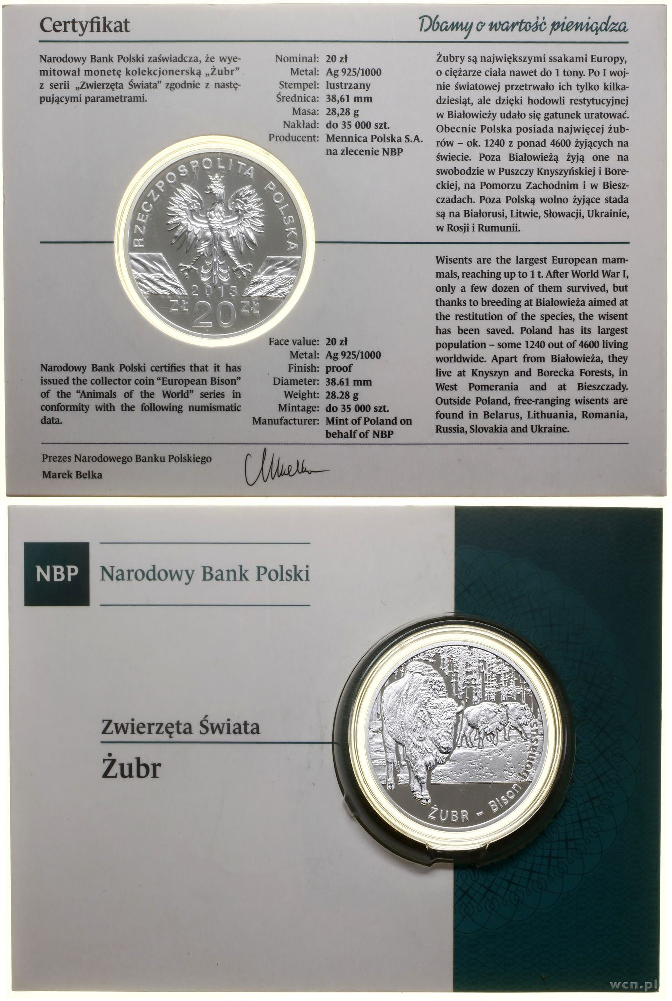Opis: Polska, III Rzeczpospolita Polska (od 1989) - monety kolekcjonerskie, 20 złotych 2013, Warszawa, Żubr – Bison bonasus, srebro próby 925, nakład do 35.000 sztuk, stemple lustrzane, moneta w plastikowym kapslu i oryginalnym etui z certyfikatem, Parchimowicz 1294