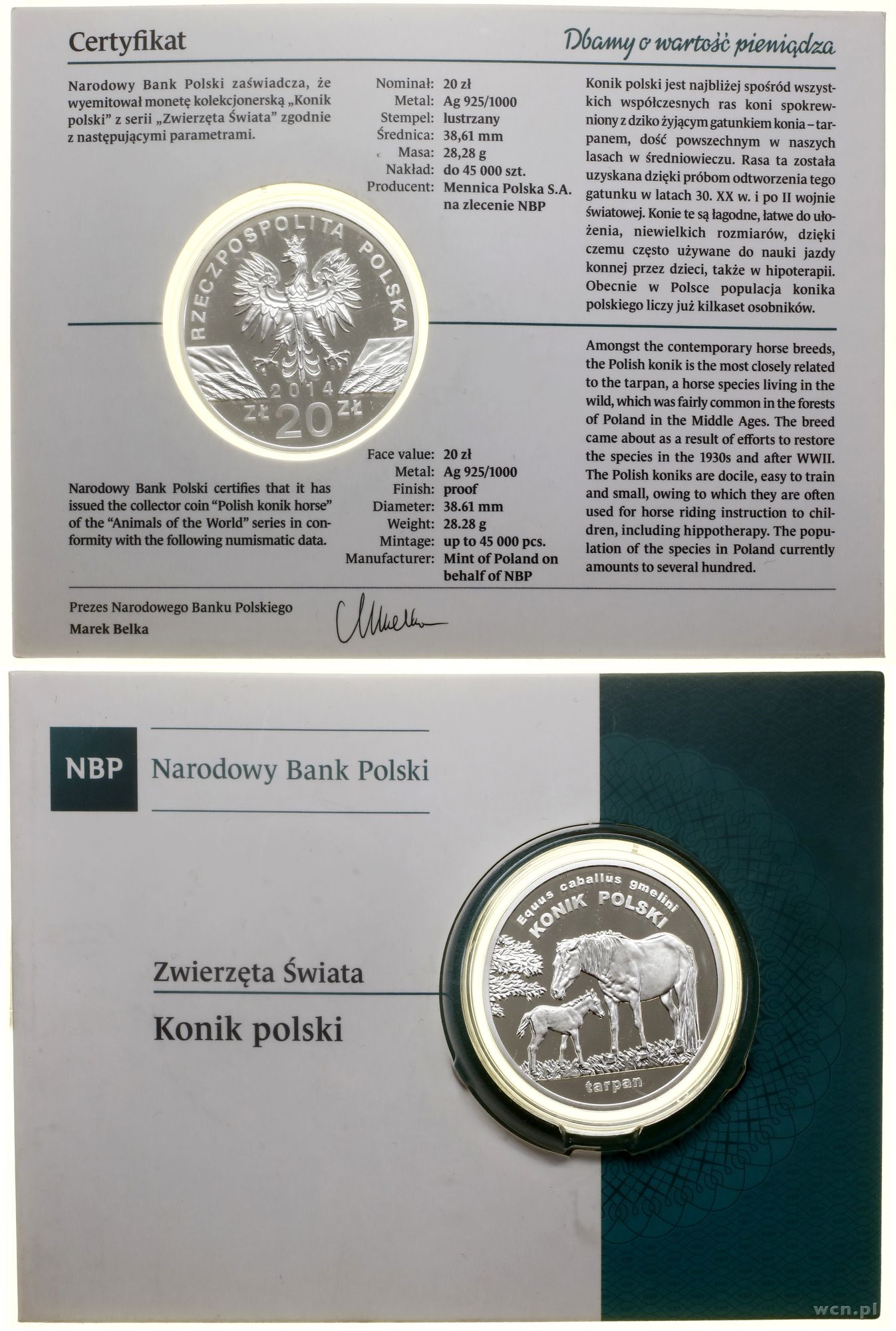 | Opis: | Polska, III Rzeczpospolita Polska (od 1989) - monety kolekcjonerskie, 20 złotych 2014, Warszawa, Konik Polski Tarpan, srebro próby 925, nakład do 35.000 sztuk, stemple lustrzane, moneta w plastikowym kapslu i oryginalnym etui z certyfikatem, Parchimowicz 1320 |