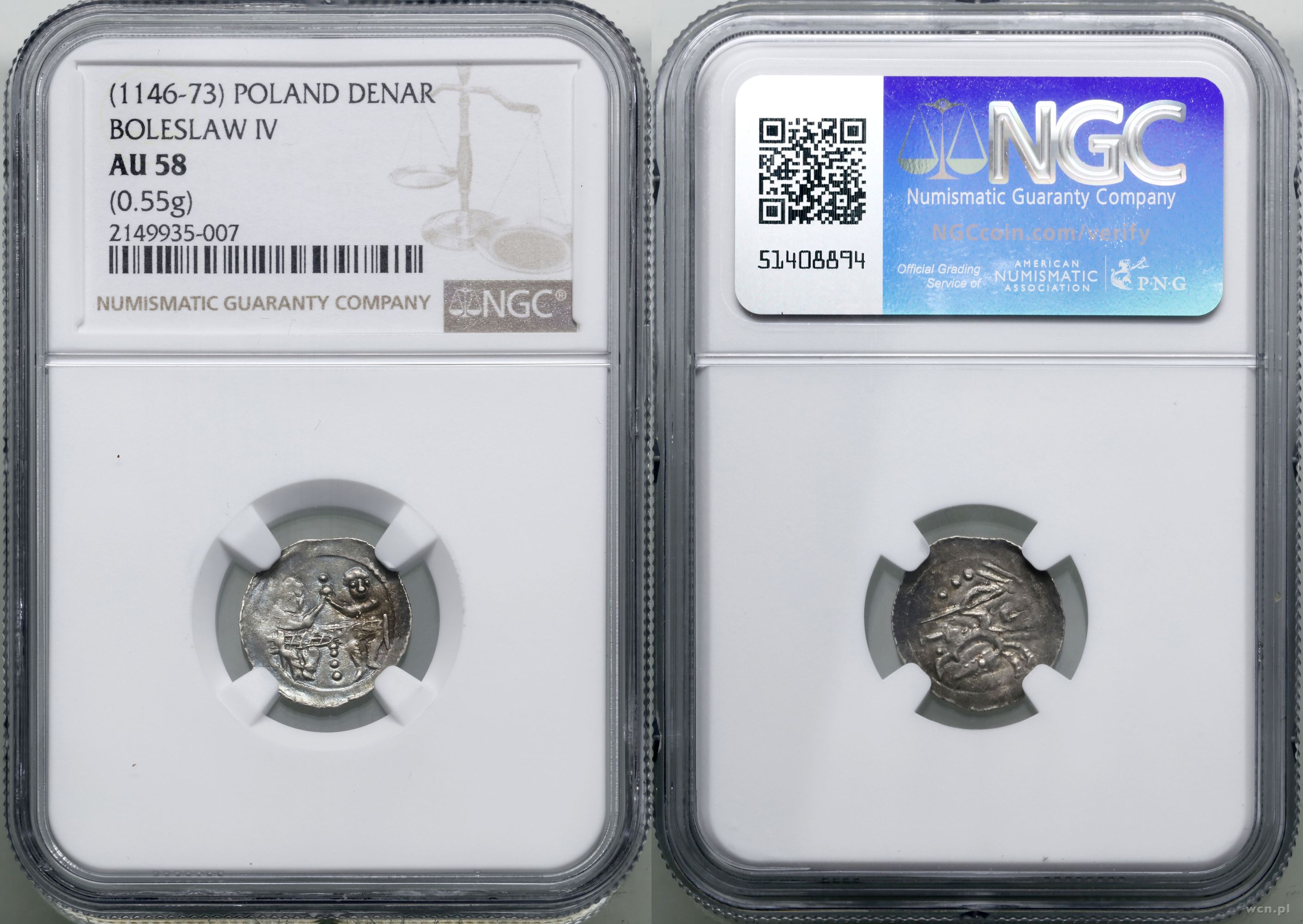 | Opis: | Polska, Bolesław IV Kędzierzawy (1146–1173), denar 1146–1157, Aw: Rycerz stojący na wprost z proporcem i tarczą w dłoniach, po bokach gwiazda i krzyż; Rw: Dwaj książęta siedzący wspólnie za stołem, skierowani ku sobie trzymają wspólnie kielich, srebro, 0.55 g, patyna, bardzo ładny egzemplarz , w opakowaniu firmy NGC nr 2149935-007 z oceną AU58, Frynas P.8.2, Gum-H. 93, Kop. 56 (R1), Str. 59, Such. XIX/2 |