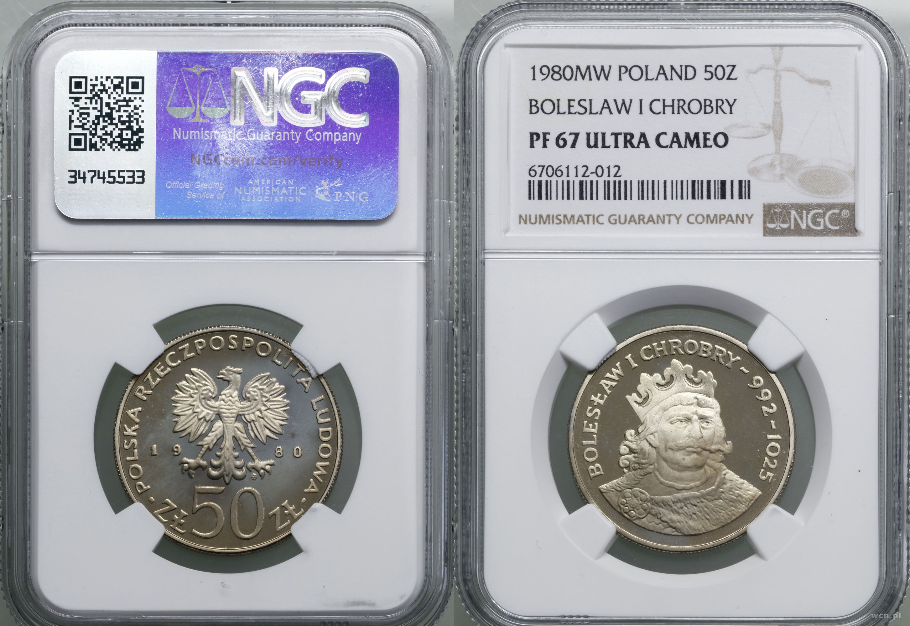 | Opis: | Polska, Polska Rzeczpospolita Ludowa (1952–1989) - monety obiegowe i kolekcjonerskie, 50 złotych 1980, Warszawa, Bolesław I Chrobry, wyśmienite, stemple lustrzane , w opakowaniu firmy NGC nr 6706112-012 z oceną PF67 ULTRACAMEO, Parchimowicz 258 |