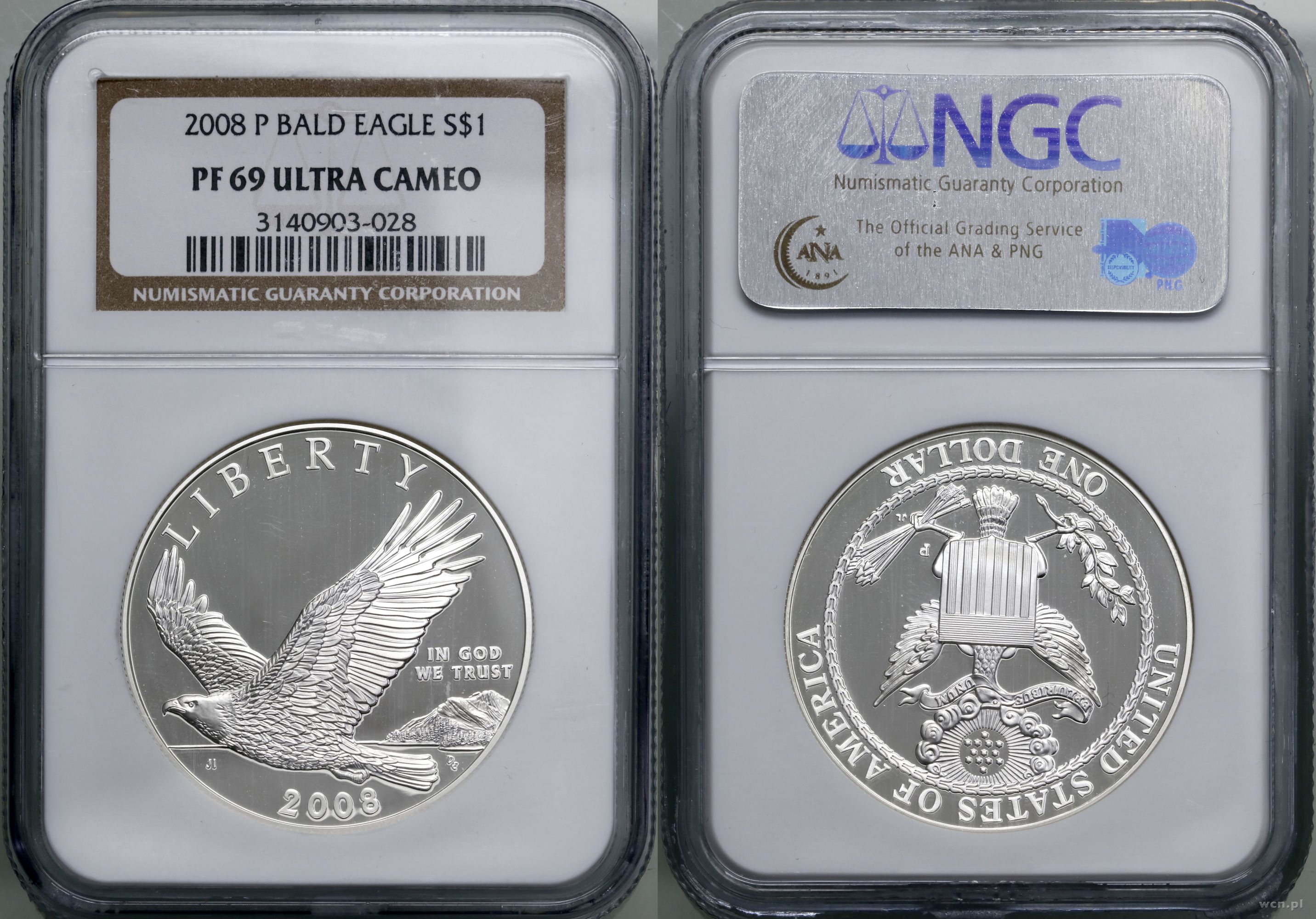 | Opis: | Stany Zjednoczone Ameryki (USA), 1 dolar 2008, Filadelfia, Amerykański orzeł, srebro próby 900, wyśmienita moneta , w opakowaniu firmy NGC nr 3140903-028 z oceną PF69 ULTRACAMEO, KM 439 |