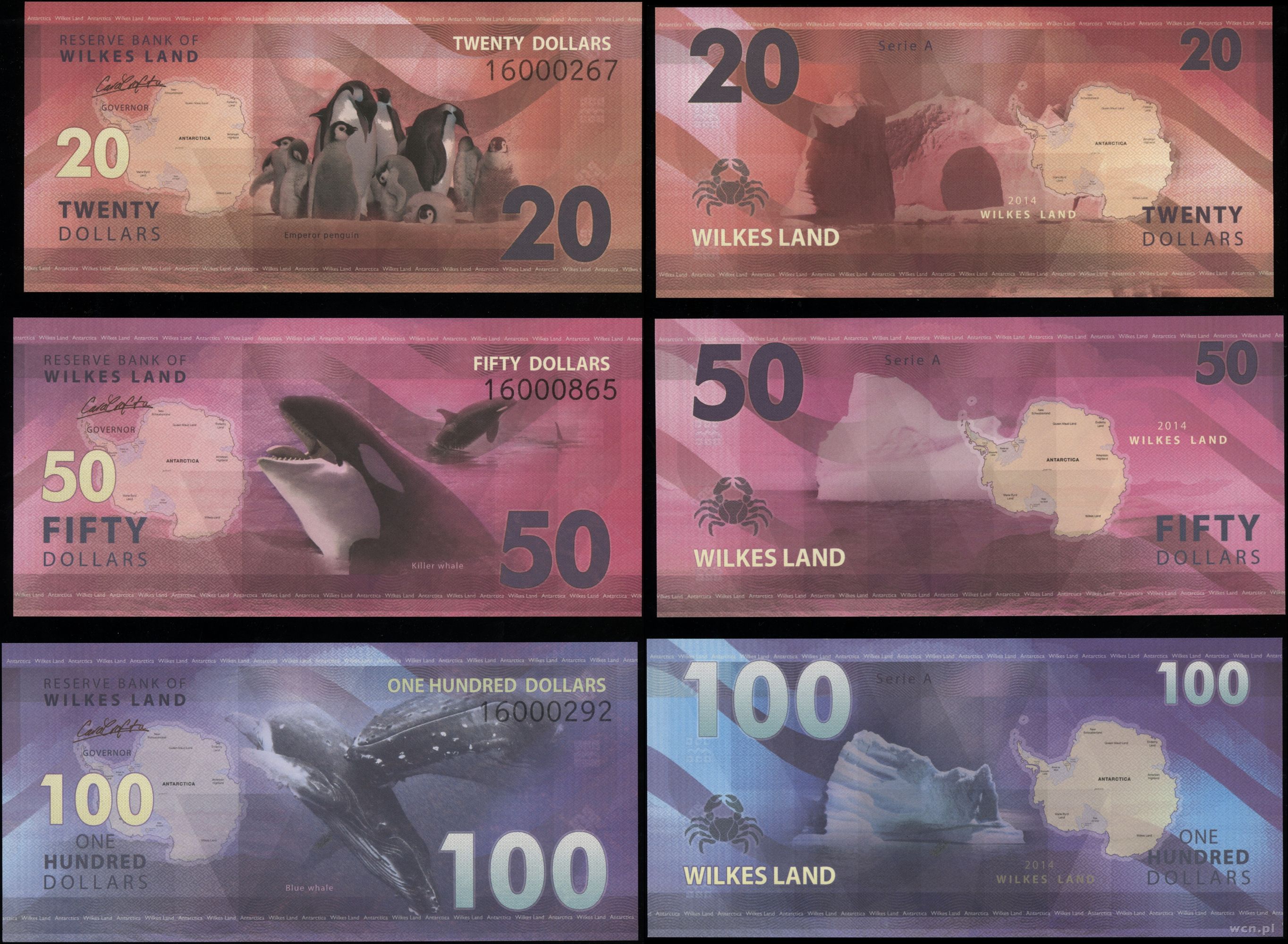 Opis: Antarktyda, Ziemia Wilkesa, zestaw 7 banknotów 2014, nominały: 1, 2, 5, 10, 20, 50, 100 dolarów, fauna arktyczna, razem 7 sztuk, wszystkie wyśmienicie zachowane