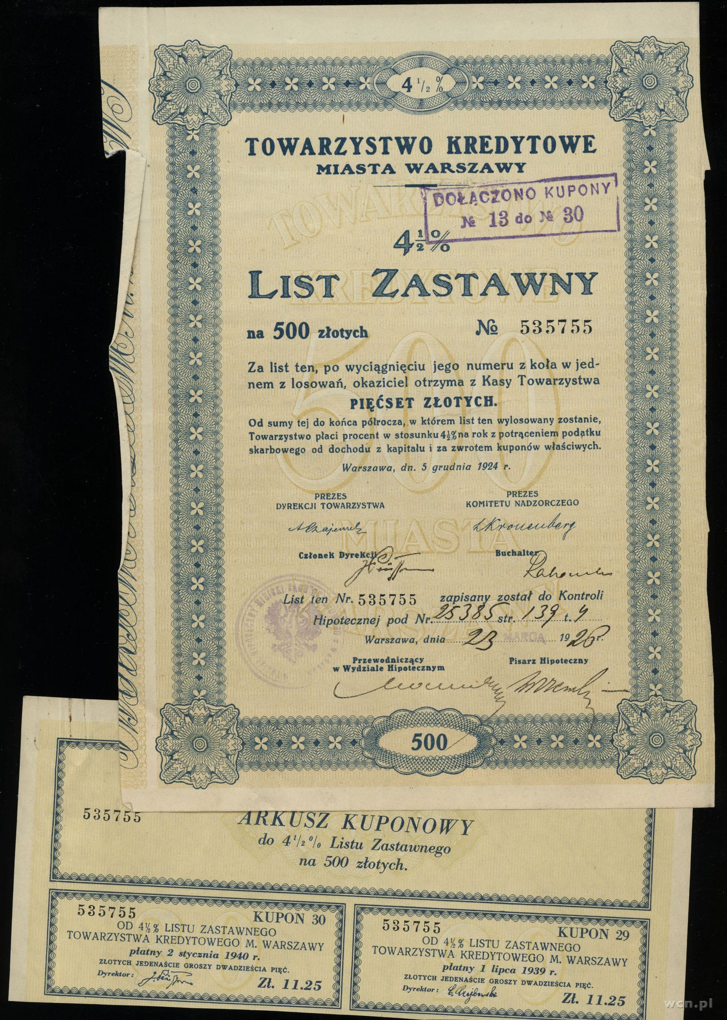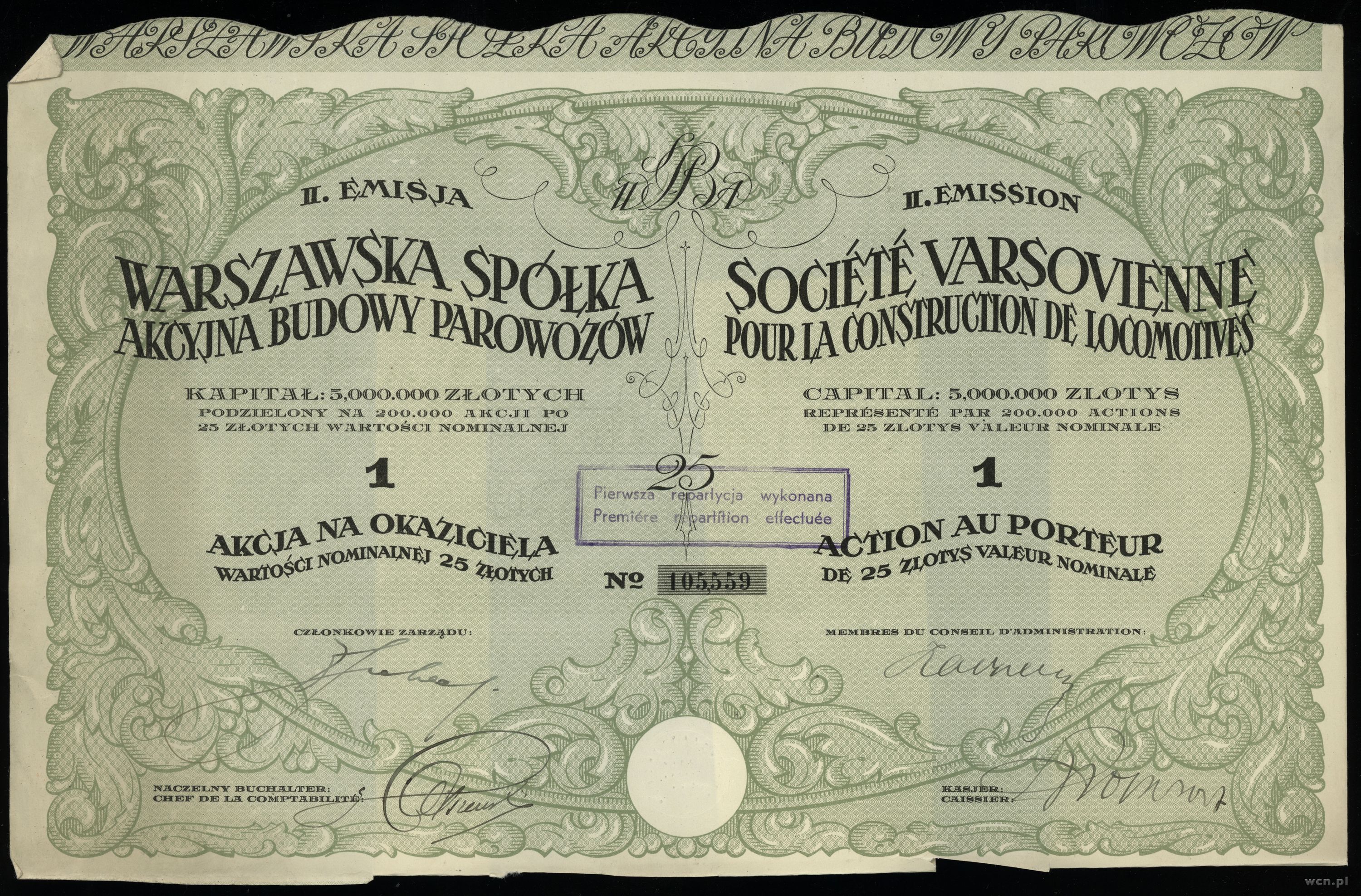 | Opis: | Polska, zestaw 3 papierów wartościowych, 1) 1 akcja na 100 złotych [Norblin, B-cia Buch i T. Werner w Warszawie - Spółka Akcyjna Fabryk Metalowych] z 7 kuponami 2) 4 1/2 % list zastawny na 500 złotych 1.04.1926 z 2 kuponami [Towarzystwo Kredytowe miasta Warszawy] 3) 1 akcja na 25 złotych 1926 z 4 kuponami [Warszawska Spółka Akcyjna Budowy Parowozów], razem 3 sztuki |