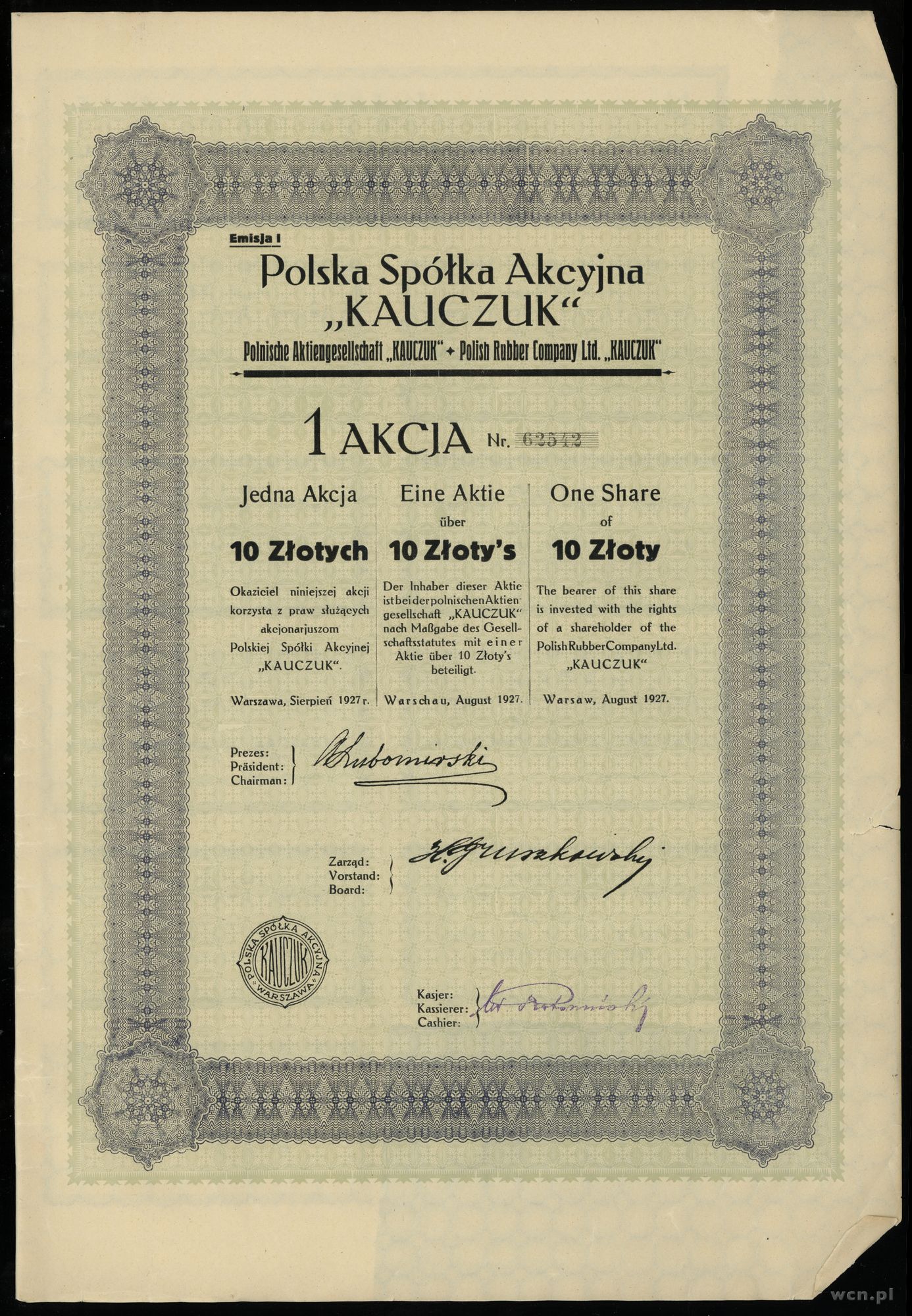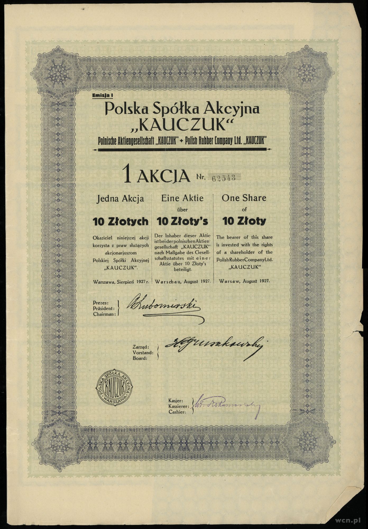 | Opis: | Polska, Polska Spółka Akcyjna “KAUCZUK”, zestaw: 5 x 1 akcja na 10 złotych sierpień 1927, numeracja między 62540 a 62544, akcje z kuponami, razem 5 sztuk, Koziorowski 1194/28, Niegrzybowski IX-H-9 |
