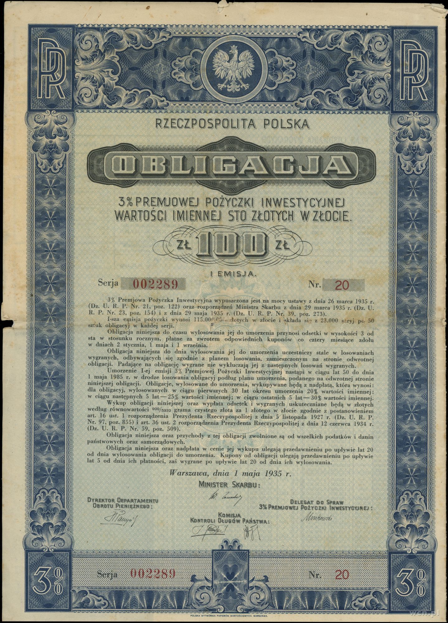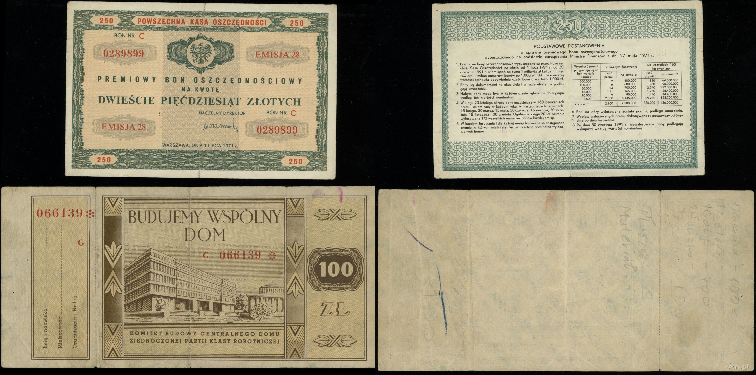 | Opis: | Polska, zestaw 4 papierów 1935–1971, 1) 3% premiowej pożyczki inwestycyjnej na 100 złotych w złocie 1.05.1935, Warszawa 2) cegiełka na budowę siedziby KC PZPR wartości 100 złotych 3) premiowy bon oszczędnościowy na 25 złotych 1.07.1971 4) 1 akcja na 100 złotych, Warszawa, Spółka Akcyjna Wielkich Pieców i Zakładów Ostrowieckich (st. I-), razem 3 sztuki |