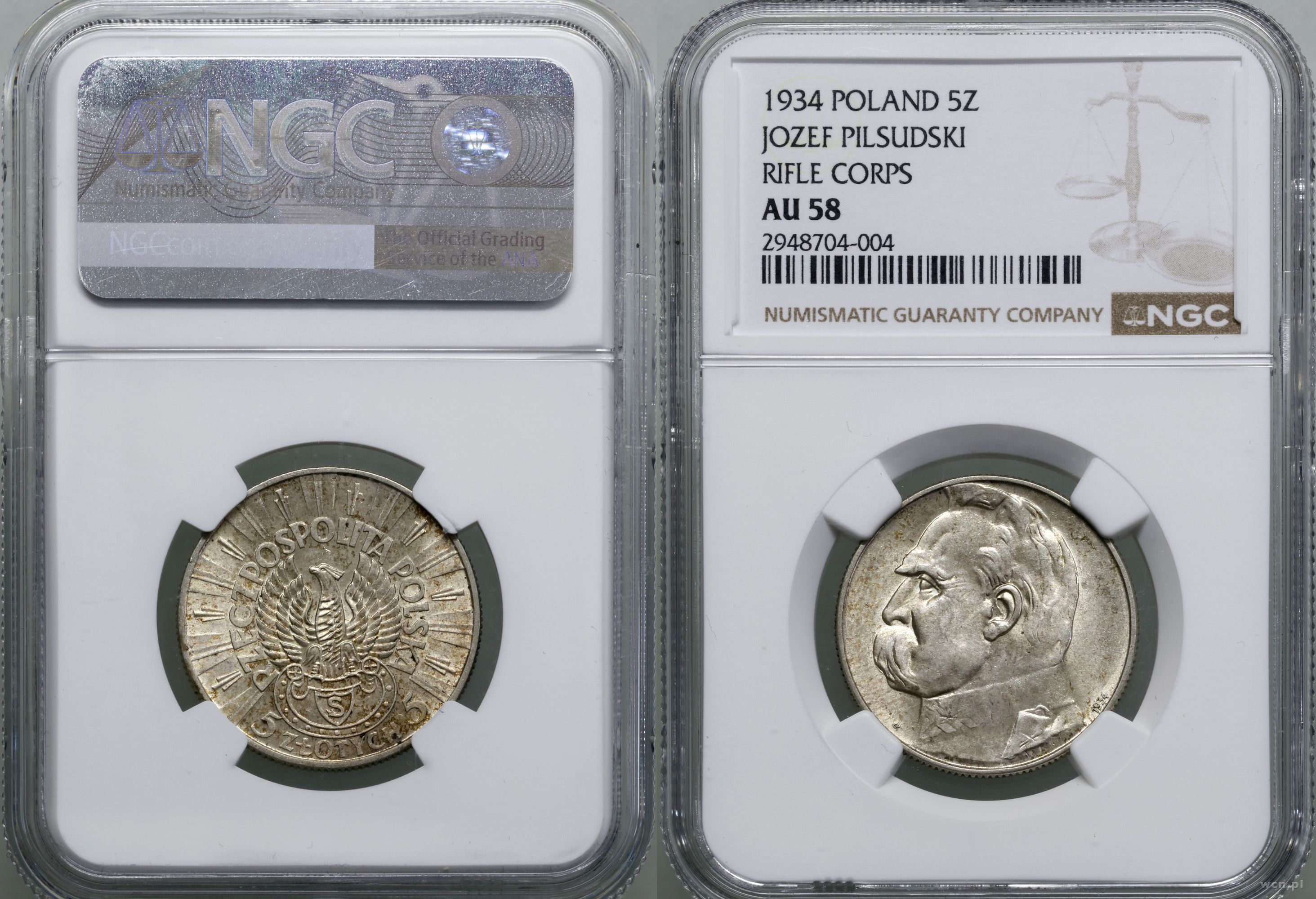 Opis: Polska, II Rzeczpospolita Polska (1918–1939) - monety obiegowe, 5 złotych 1934 S, Warszawa, Józef Piłsudski - Orzeł Strzelecki, bardzo ładne , w opakowaniu firmy NGC nr 2948704-004 z oceną AU58, Parchimowicz 117