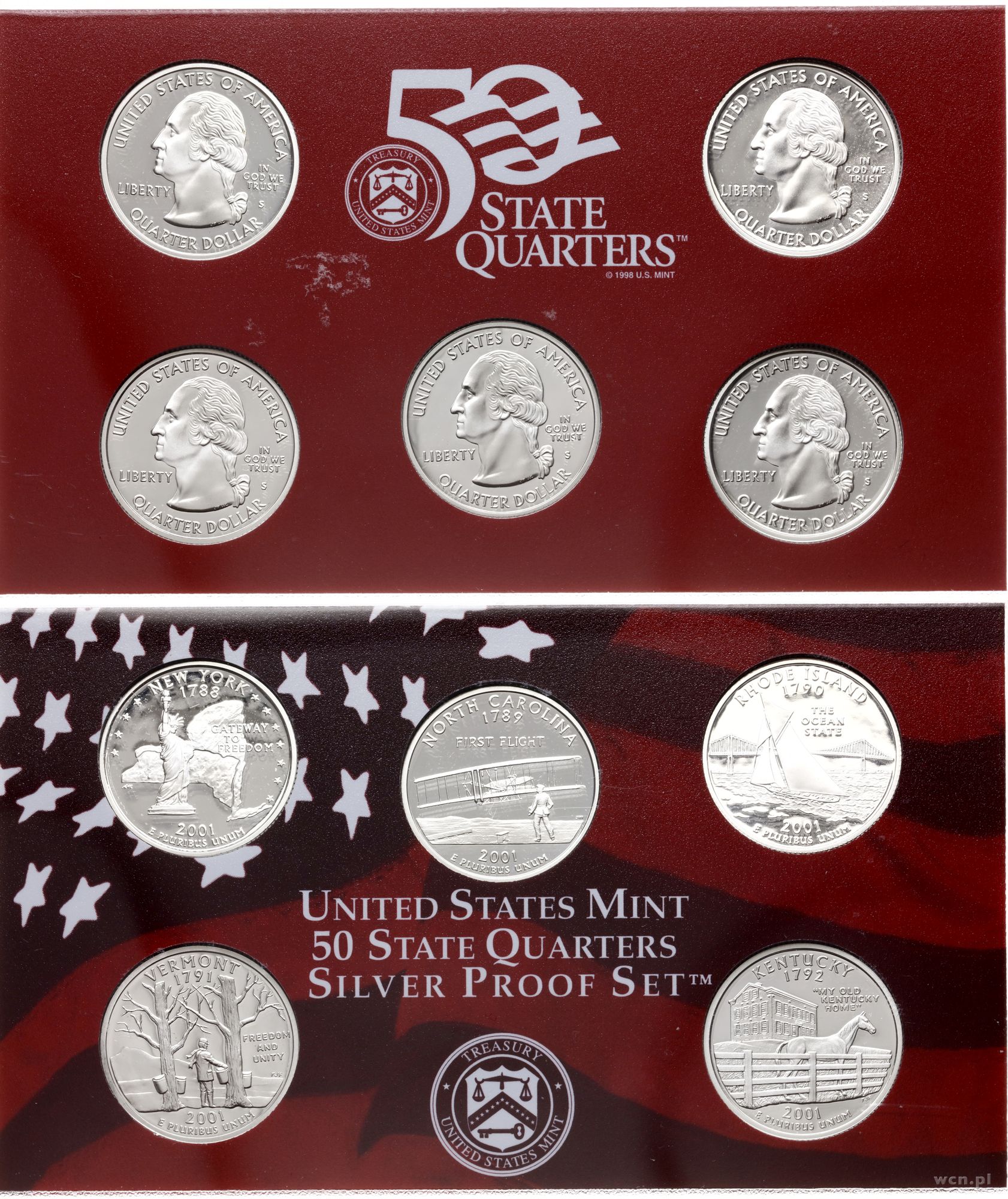 Opis: Stany Zjednoczone Ameryki (USA), zestaw rocznikowy 2001, San Francisco, dwa zestawy po 5 monet, z czego jeden to 5 x 1/4 dolara wybite w srebrze a drugi 1, 5, 10 centów (srebro) i 1/2 dolara (srebro) oraz 1 dolar, stemple lustrzane, razem 10 monet w dwóch pudełkach wraz z certyfikatem