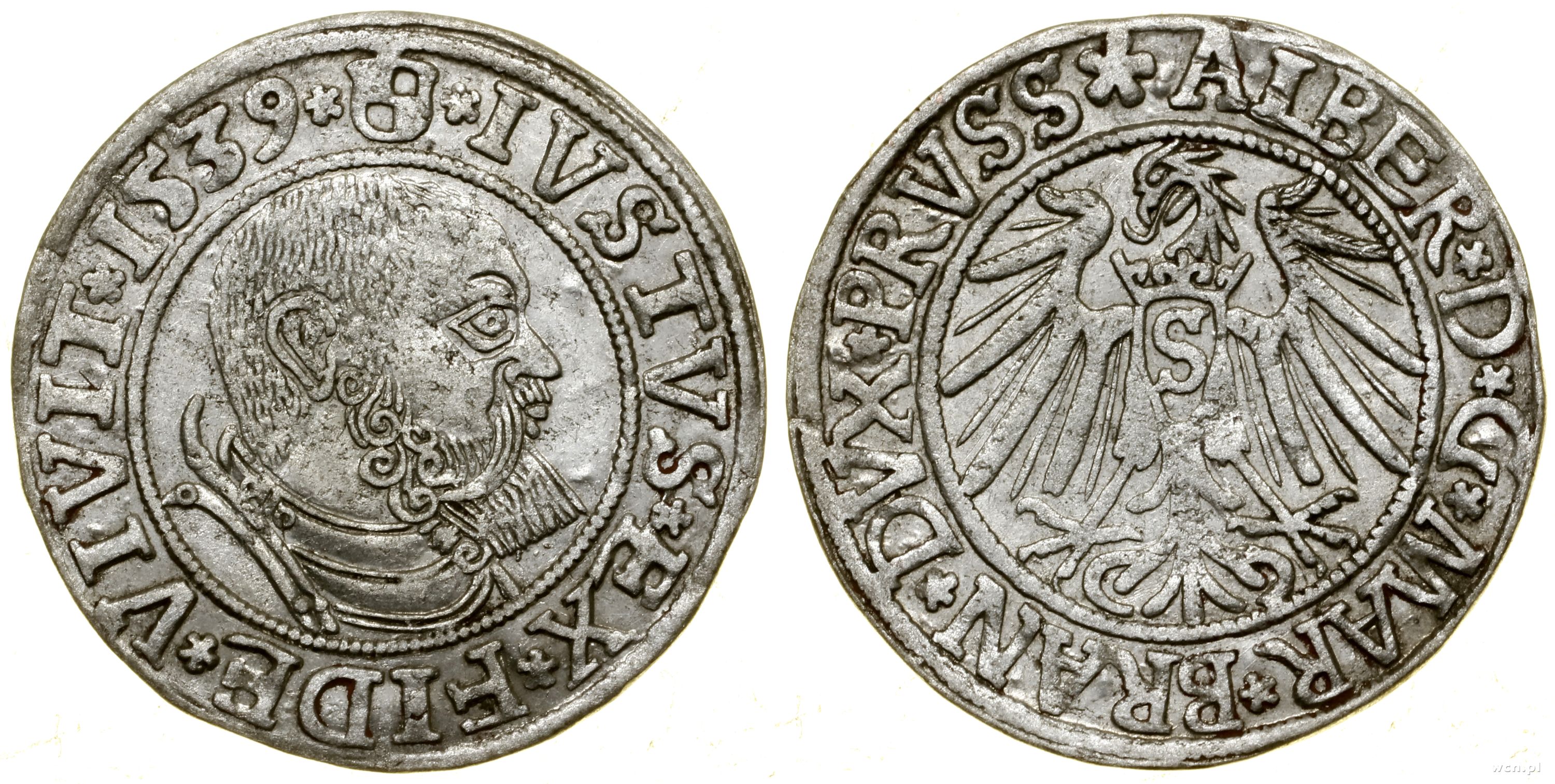 grosz 1539, Królewiec, końcówka legendy rewersu PRVSS, ładnie zachowana moneta z blaskiem menniczym, Kop. 3780, Slg Marienburg 1169, Vossberg 1359 |
