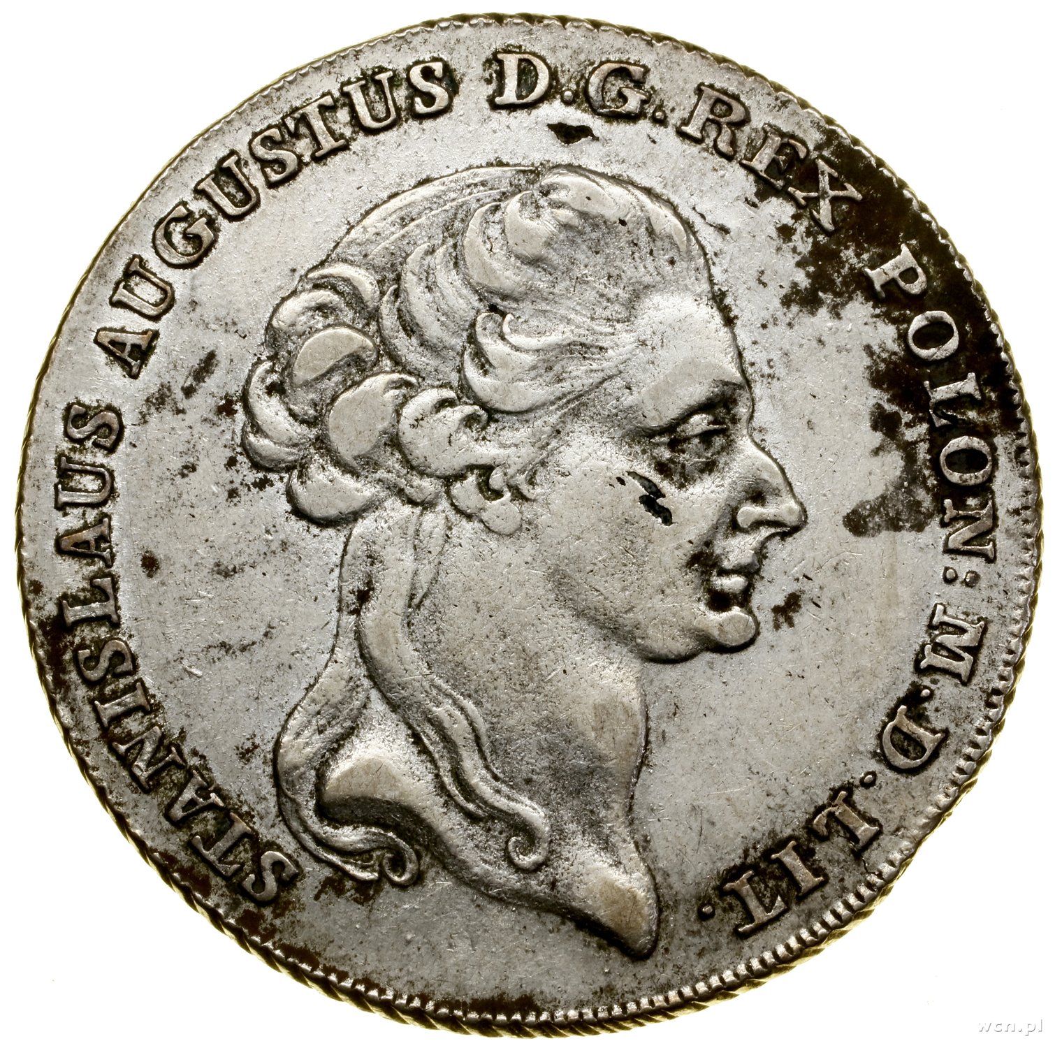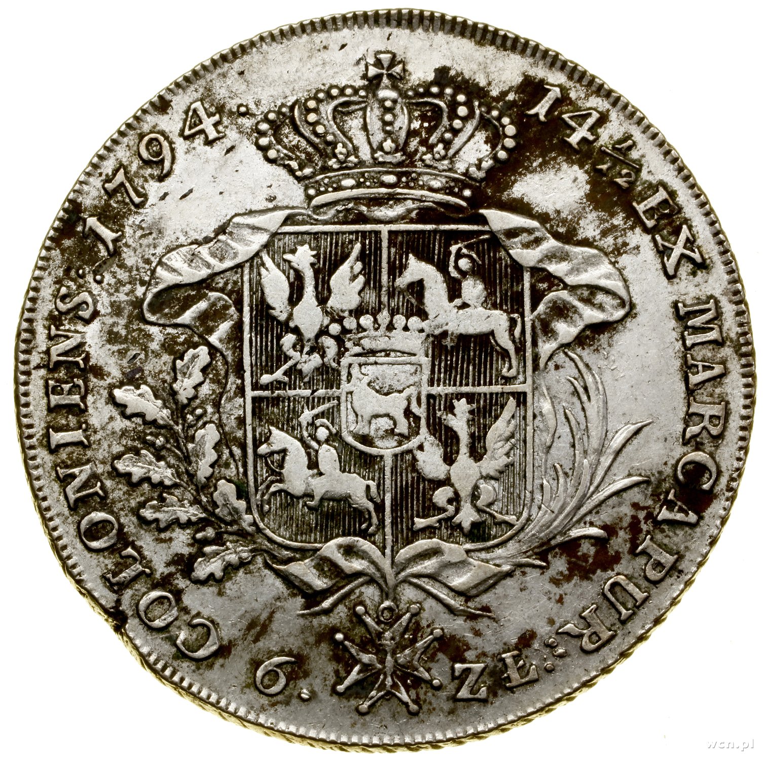 Talar sześciozłotowy, 1794, Warszawa; Aw: Głowa króla w prawo, STANISLAUS AUGUSTUS D G REX POLON M D LIT; Rw: Ukoronowana, pięciopolowa tarcza herbowa, całość otoczona wstęgą oraz wieńcem z liści palmowych i dę..