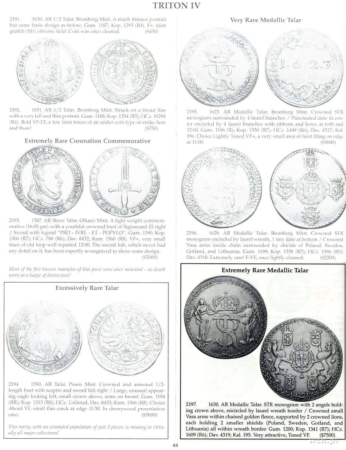 | Opis: | Zygmunt III Waza (1587–1632) / monety koronne. Talar medalowy, 1630, Bydgoszcz; Aw: Monogram STR (Sigismundus Tertius Rex) pod koroną podtrzymywaną przez dwa anioły trzymające gałązki palmowe, całość otoczona wieńcem z gałęzi lauru; Rw: Pośrodku ukoronowana i ozdobiona łańcuchem z Orderem Złotego Runa tarcza z herbem Wazów, po bokach lwy podtrzymujące tarcze z herbami Polski i Szwecji, wsparte u dołu na tarczach z herbami Litwy i Gotów, po bokach data 16 - 30, całość otoczona wieńcem z gałęzi lauru; Chełmiński 301, Davenport 4319, Frankiewicz 211, Gum-Bydg. 961, Gum-H. 1200 (R), Gumowski (Medale Zygmunta III) 104, H-Cz. 1609 (R6), Jackowski 40 (120 rubli), Kop. 1341 (R7), Kopicki (ZIIIW) 1002.a (R8), Kurp. (1587–1632) 1641 (R7), Mikocki 838 (RRR), Radziwiłł - posiadał, Stahr (Medale Wazów w Polsce 1587–1668) 30, Zagórski 319, Tyszkiewicz 300 mk; srebro, 29.85 g; ekstremalnie rzadki typ monety, egzemplarz z kolekcji Henry’ego V. Karolkiewicza, Triton IV 2000, poz. 2197, z dołączoną fiszką aukcyjną. |