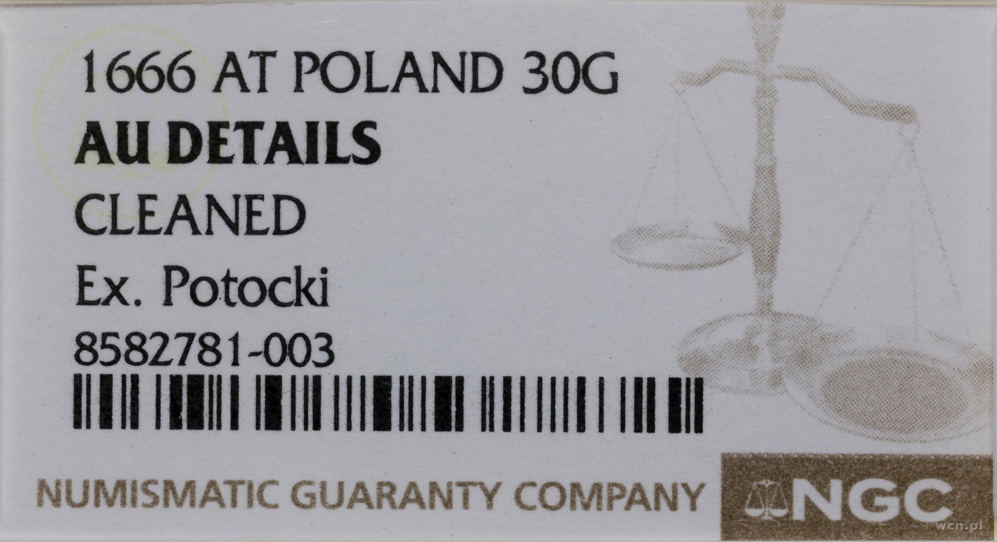 | Opis: | Jan II Kazimierz (1649–1668) / monety koronne. Tymf (złotówka), 1666 AT, Bydgoszcz; w legendzie awersu SEVATA SALVS, REG POL w legendzie rewersu; Kop. 1792, Kurp. (1649–1696) 523, Szłapinskij ryc. 129 (R3); moneta w pudełku NGC 8582781-003, z oceną AU DETAILS / CLEANED; na awersie punca z herbem Pilawa Potockich; lekko czyszczony, ale piękny stan zachowania jak na ten typ monety. |