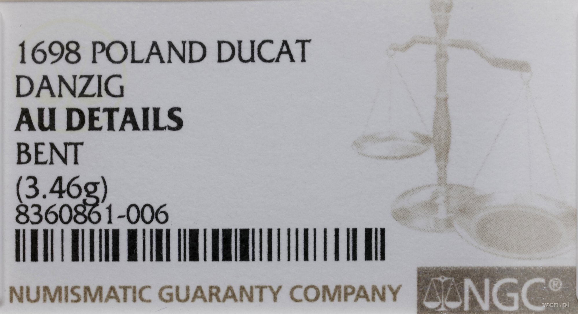 | Opis: | August II Mocny (1697–1733) / miasto Gdańsk. Dukat, 1698, Gdańsk; Aw: Popiersie władcy w prawo, AVGVST II D G REX POL M D L R P ET S; Rw: Herb wielki miasta Gdańska, MON AUREA CIVITAT GEDAN 1698; Chełmiński 1179, Fr. 41, Frankiewicz 804, H-Cz. 2612 (R3), Kaleniecki str. 488, Kahnt 337, Kop. 2703 (R5), Kubicki 1552, Kurp. (1697–1764) 31 (R5), Tyszkiewicz 30 mk; złoto, 3.46 g; krążek gięty, bardzo rzadki typ monety; moneta w pudełku NGC 8360861-006 z oceną AU DETAILS / BENT. |