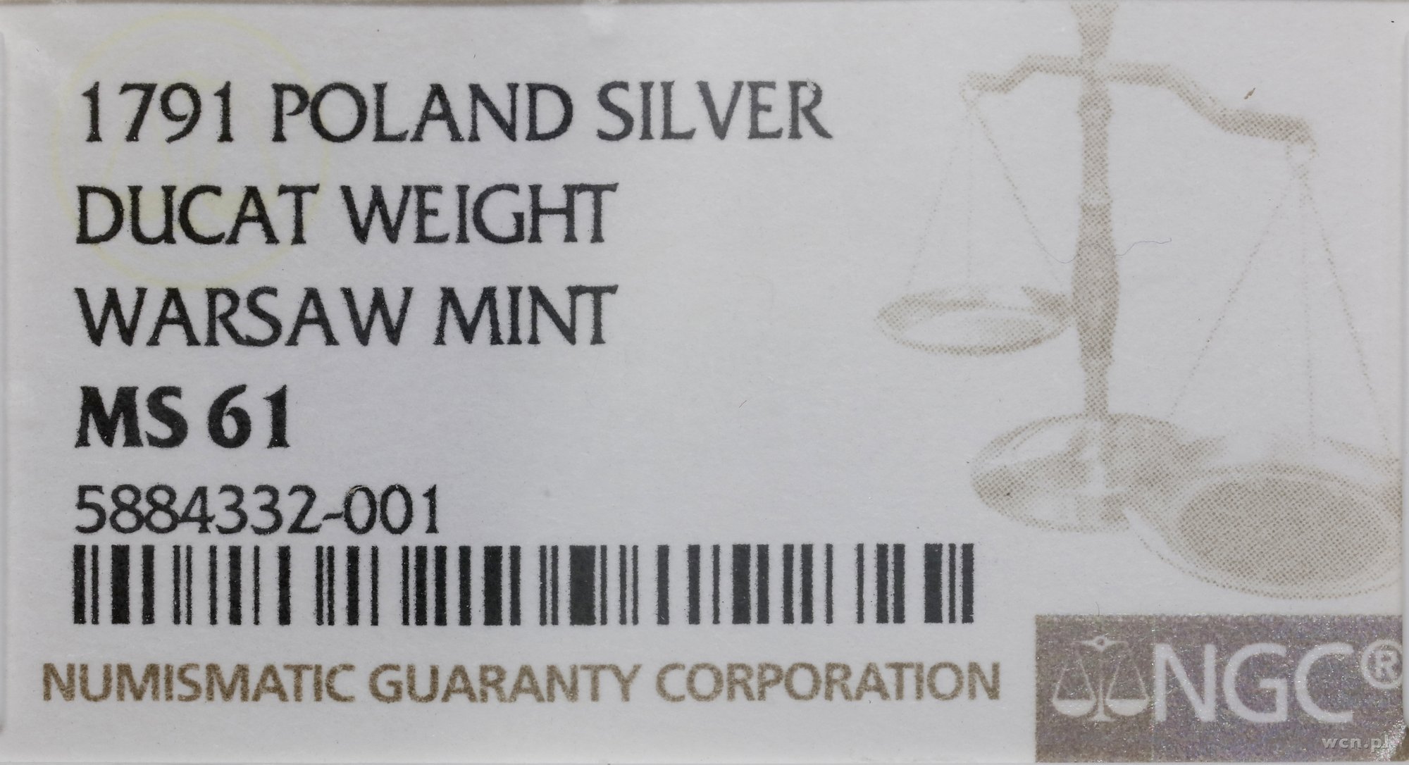 | Opis: | Stanisław August Poniatowski (1764–1795) / odważniki monetarne. Odważnik dukata, 1791, Warszawa; Aw: Orzeł, trzymający w szponach miecz i klucz; Rw: Napis poziomy w pięciu wersach i / AUREI / NUMMI / PONDUS /1791 i w otoku 67 EX MARCA COLONIENSE; Plage 480; srebro; bardzo ładny egzemplarz w pudełku NGC 5884332-001 z oceną MS61. |