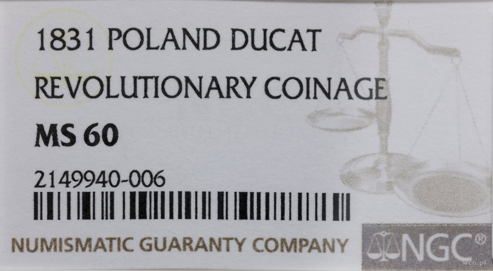 | Opis: | Powstanie Listopadowe (1830–1831). Dukat, 1831, Warszawa; Aw: Stojący rycerz z mieczem i pękiem strzał, po bokach data 18 - 31, w otoku pochodnia z kropką za nią, Orzeł polski oraz napis CONCORDIA RES PARVAE CRESCUNT; Rw: W kwadracie z ornamentami napis w czterech wierszach MO AUR / REG BELGII / AD LEGEM / IMPERII; Bitkin 1, Fr. 114, H-Cz. 3659 (R), Kop. 2750 (R1), Plage 271, Berezowski 37.50 zł; pięknie zachowany egzemplarz, najwyższy nominał powstańczej emisji, moneta w pudełku NGC 2149940-006 z oceną MS60. |