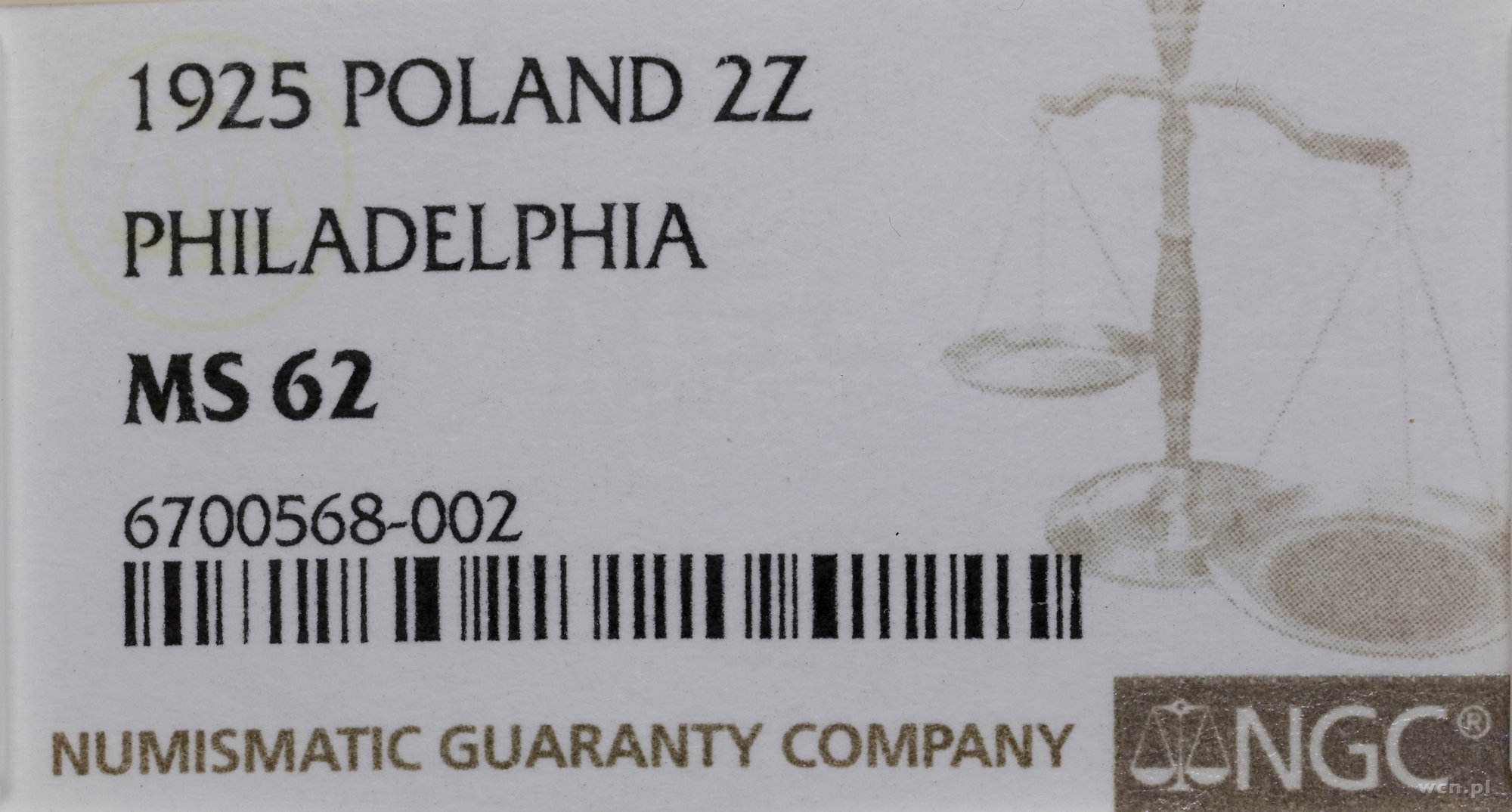 | Opis: | II Rzeczpospolita Polska (1918–1939) / monety obiegowe. 2 złote, 1925, Filadelfia; popiersie kobiety z kłosami, odmiana bez kropki po dacie; Kop. 2901 (R), Parchimowicz 109e; pięknie zachowana moneta w opakowaniu firmy NGC 6700568-002 z oceną MS62. |