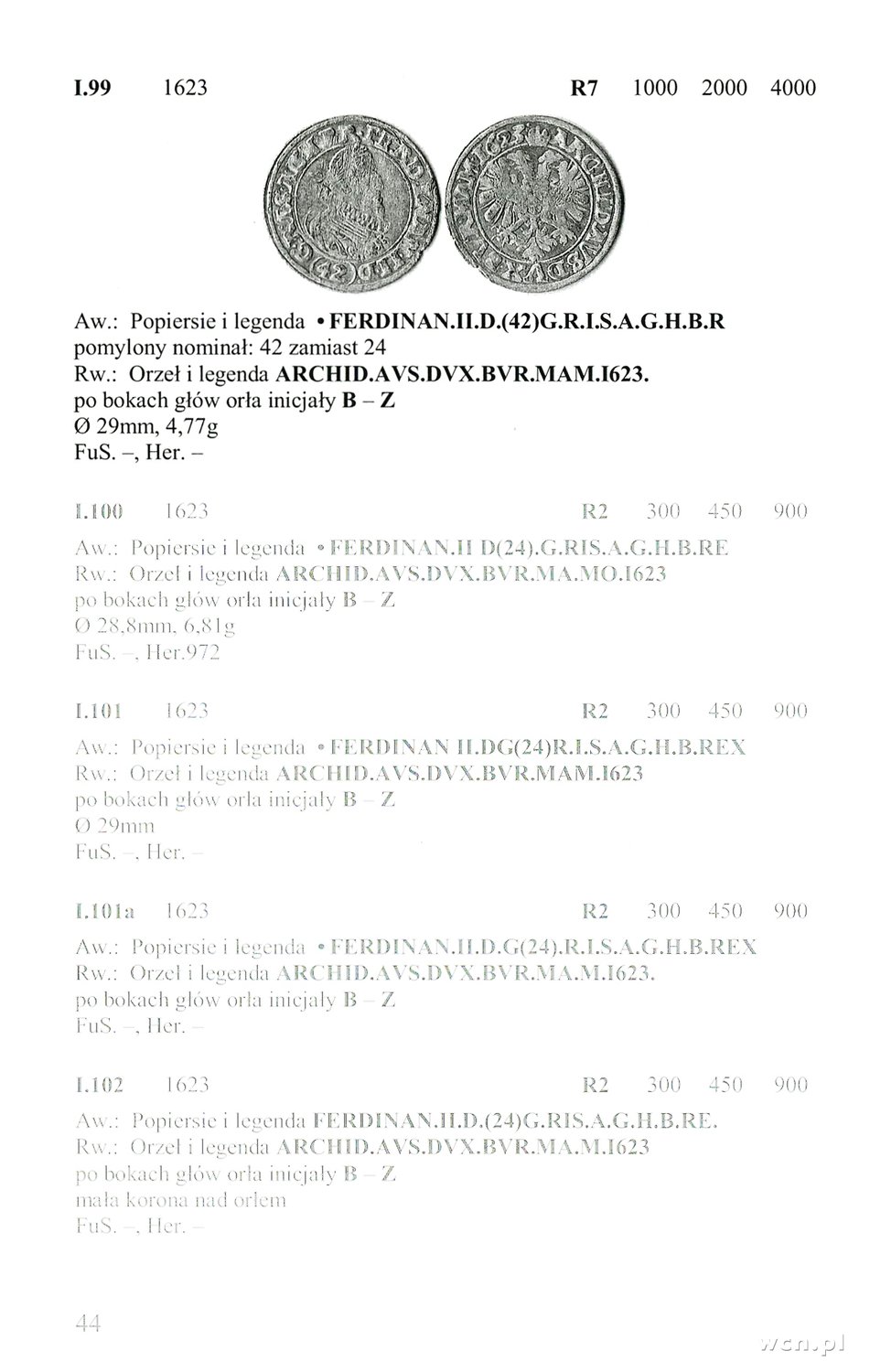 | Opis: | Śląsk pod panowaniem habsburskim / Ferdynand II (1619–1637). 24 krajcary 1623, mennica nieokreślona (Nysa?); bardzo rzadka odmiana z pomylonym nominałem 42 zamiast 24; E.-M. I.99 (R7), F.u.S. –; stara patyna, bardzo rzadki typ monety, egzemplarz ilustrowany w katalogu monet 24-krajcarowych autorstwa Ejzenharta i Millera. |