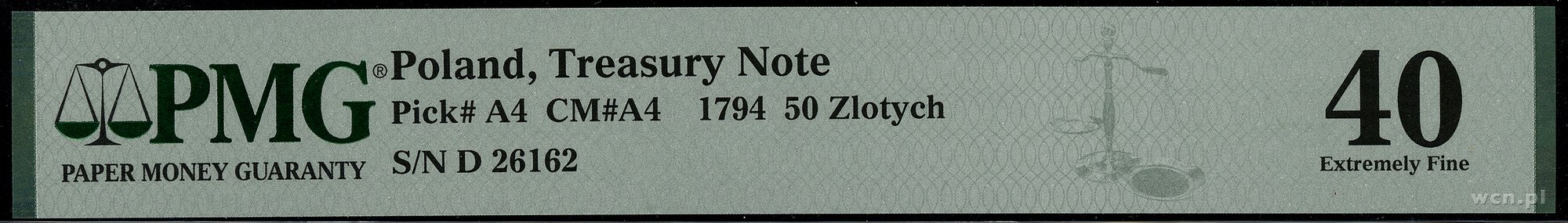 | Opis: | POLSKA / Insurekcja Kościuszkowska (1794). 50 złotych polskich, 8.06.1794; seria D, numeracja 26162, papier bez znaku wodnego, podpisy Jana Klemensa Gaczkowskiego i Jana Kleka; Lucow 32 (R2), Miłczak A4; ugięcia w poziomie, u dołu ślady po podlepkach, odcięty fragment prawego dolnego rogu, banknot w opakowaniu PMG 2202944-002 z oceną Extremely Fine 40. |