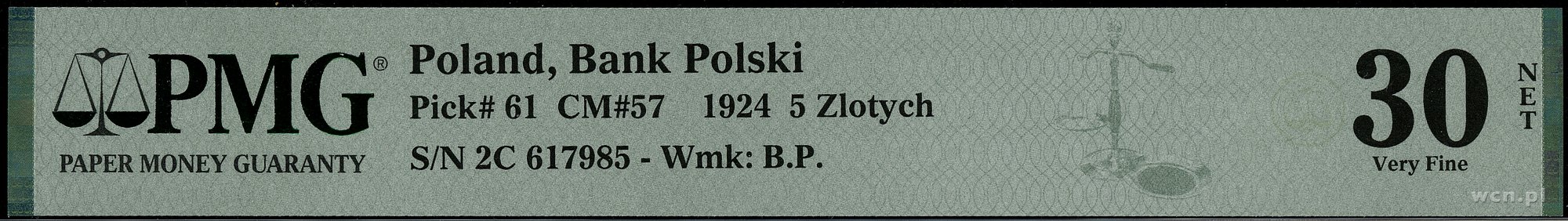 | Opis: | II Rzeczpospolita Polska (1918–1939) / emisje po reformie Władysława Grabskiego. 5 złotych, 15.07.1924; II emisja, seria C, numeracja 617985; Lucow 604 (R5) - (nie notuje tej serii), Miłczak 57; banknot po konserwacji, ślady po złamaniach, rzadki typ, egzemplarz w opakowaniu PMG 1922528-003 z oceną Very Fine 30 NET. |