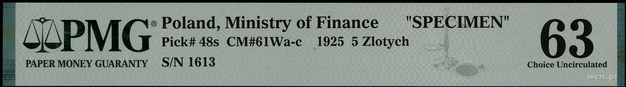 | Opis: | II Rzeczpospolita Polska (1918–1939) / emisje po reformie Władysława Grabskiego. 5 złotych, 1.05.1925; seria A, numeracja 1234567 / 8901234, czerwony nadruk WZÓR i poziomo BEZ WARTOŚCI po obu stronach banknotu, dwukrotnie perforowane, dodatkowa numeracja wzoru 1613; Lucow 707 (R4), Miłczak 61Wb; delikatne nieświeżości, ale pięknej prezencji banknot w opakowaniu PMG 1909379-020 z oceną Choice Uncirculated 63. |