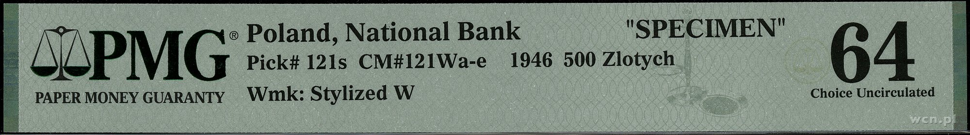 | Opis: | POLSKA / Polska powojenna (1944–1952). 500 złotych, 15.01.1946; seria A, numeracja 8900000 / 1234567, czerwone dwukrotne przekreślenie i poziomo SPECIMEN po obu stronach banknotu; Lucow 1153 (R6), Miłczak 121Wb; pięknie zachowany banknot w opakowaniu PMG 2201700-084 z oceną Choice Uncirculated 64. |