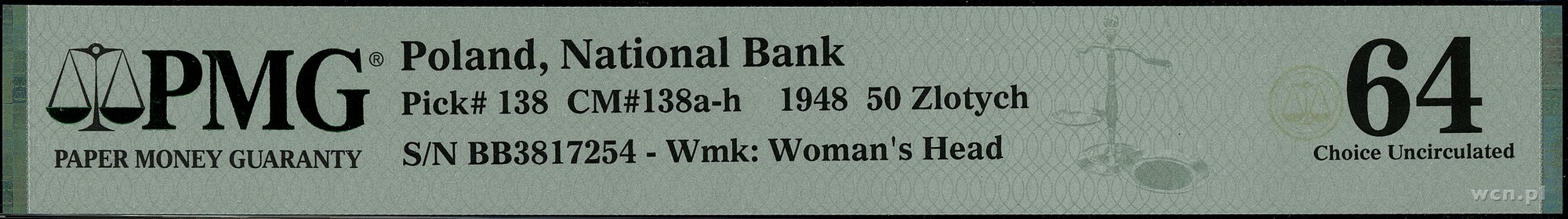 | Opis: | POLSKA / Polska powojenna (1944–1952). 50 złotych, 1.07.1948; seria BB, numeracja 3817254; Gucwa G3, Lucow 1285 (R2), Miłczak 138e; pięknej prezencji banknot w opakowaniu PMG 2201700-099 z oceną Choice Uncirculated 64. |