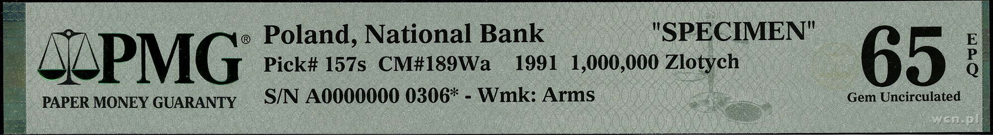 | Opis: | POLSKA / III Rzeczpospolita Polska od 1989. 1.000.000 złotych, 15.02.1991; seria A, numeracja 0000000, czerwony nadruk SPECIMEN/WZÓR, dodatkowa numeracja wzoru 0306*; Lucow 1541 (R5), Miłczak 189Wa; piękny banknot w opakowaniu PMG 2202955-059 z oceną Gem Uncirculated 65 EPQ. |