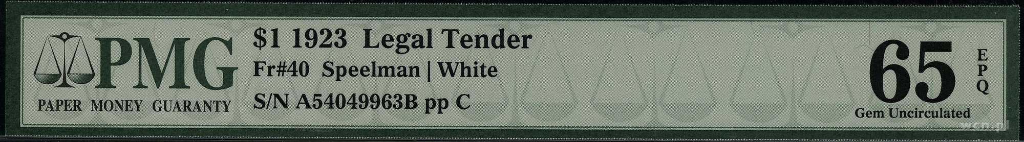 | Opis: | Stany Zjednoczone Ameryki (USA) / Legal Tender Note. 1 dolar, 1923; seria A54049963B, podpisy Speelman i White, czerwona pieczęć; Fr. 40; rzadko spotykany w tak doskonałym stanie zachowania, banknot w opakowaniu PMG 1189513-016 z oceną Gem Uncirculated 65 EPQ. |