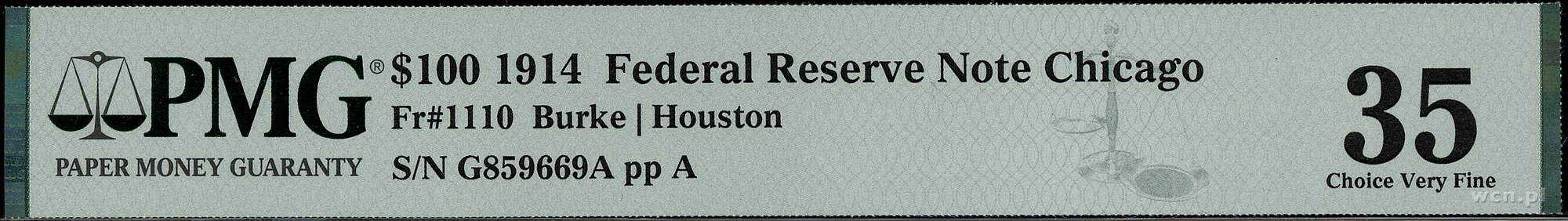 | Opis: | Stany Zjednoczone Ameryki (USA) / Federal Reserve Bank Notes. Illinois – Chicago; 100 dolarów, 1914; seria G859669A, podpisy Burke i Houston, niebieska pieczęć; Fr. 1110; ugięcia i nieświeżości papieru, ale ładnej prezencji banknot w opakowaniu PMG 1915351-003 z oceną Choice Very Fine 35. |