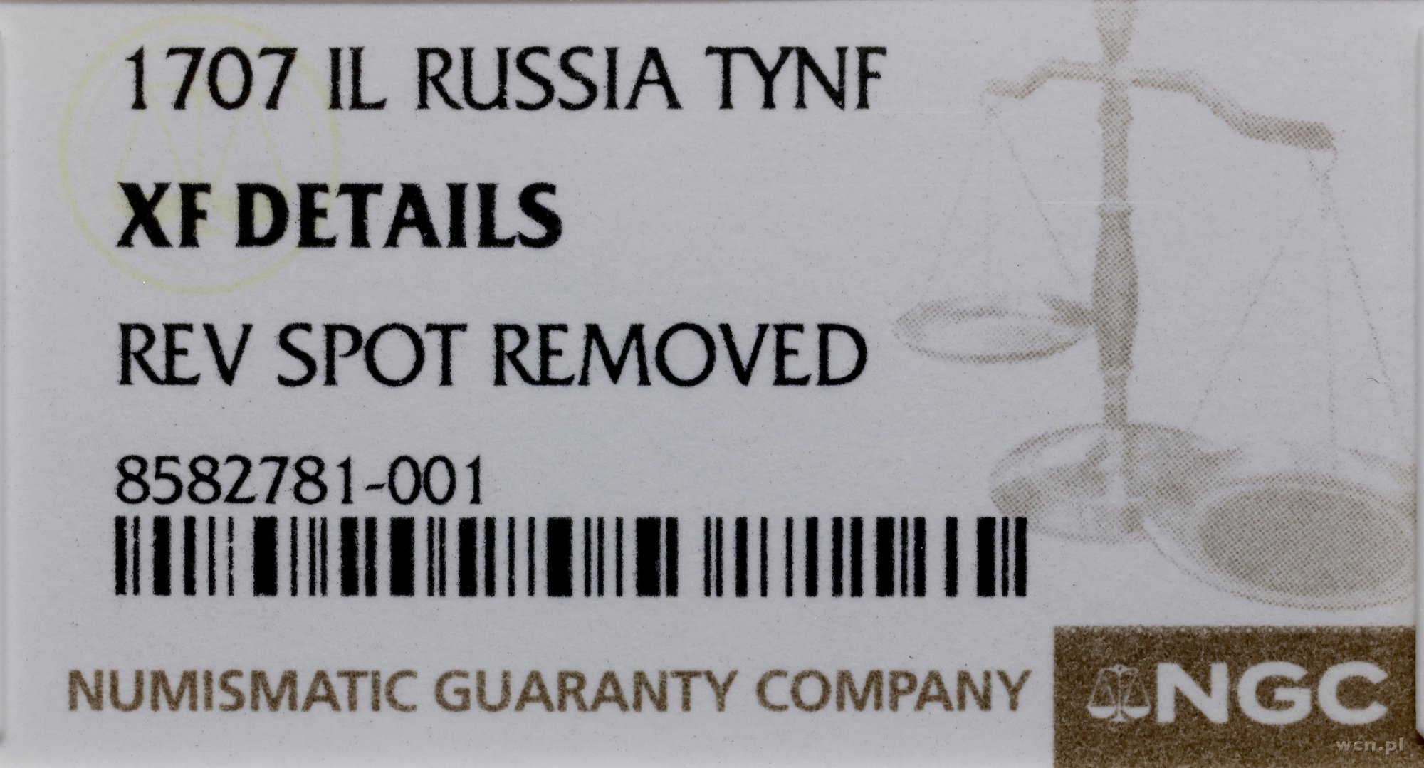| Opis: | ROSJA / Piotr I (1689–1725). Czech (tymf), 1707, Kadaszewski Dwor; Aw: Popiersie w prawo, ЦРЬ I В К ПЕТРЪ АЛЕѮIЕВИЧЪ; Rw: Dwugłowy Orzeł carski pod koroną, z lewej strony Orła litery IL, ВСЕА РОСIИ ПОВЕЛIТЕЛЬ 1707; Bitkin 3812 (R2), Diakov 7, Uzdenikow 4854; srebro, 5.83 g; bardzo rzadki typ monety w pudełku NGC 8582781-001 z oceną XF DETAILS / REV SPOT REMOVED. |