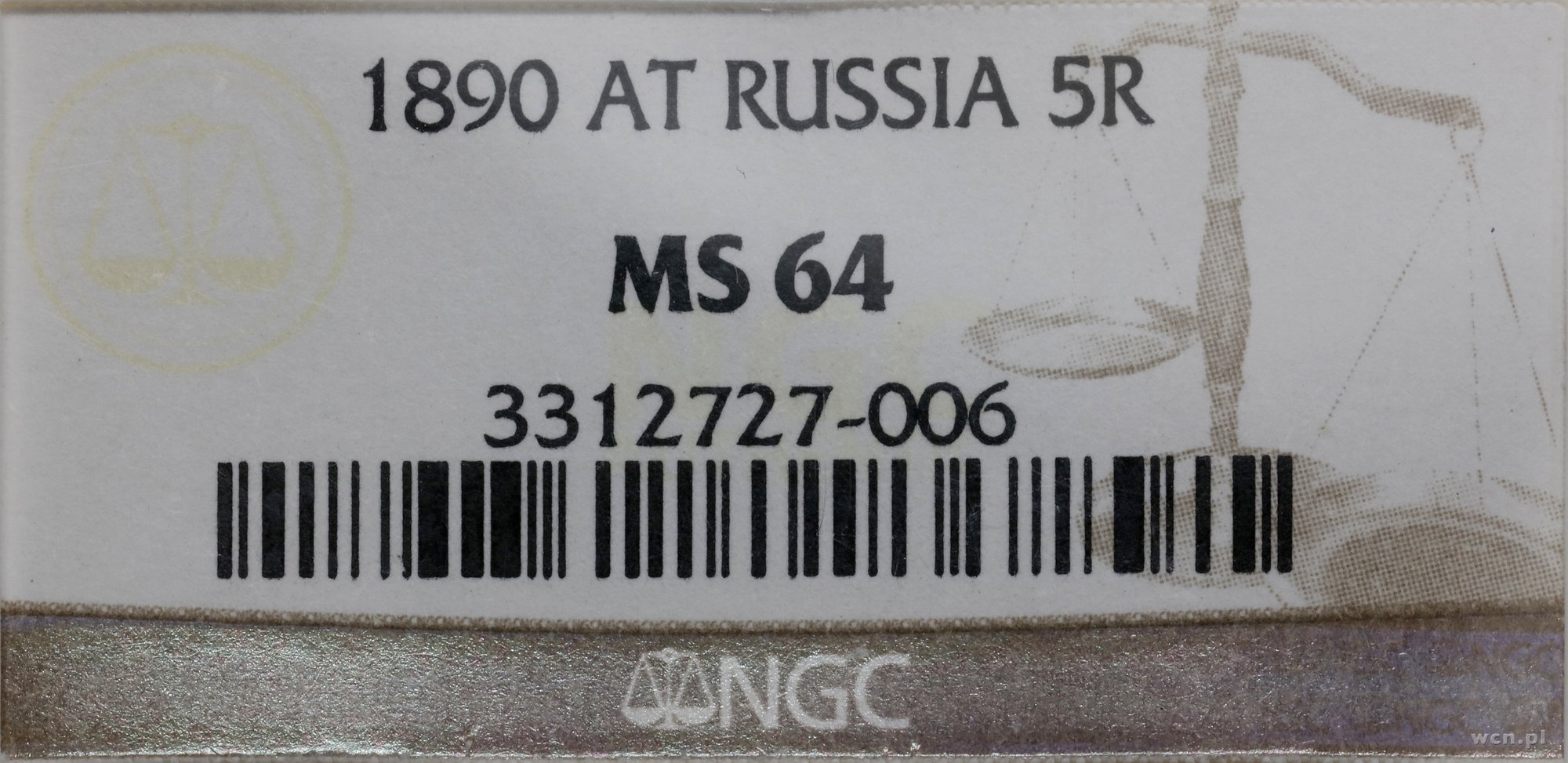| Opis: | ROSJA / Aleksander III (1881–1894). 5 rubli, 1890 (А•Г), Petersburg; Bitkin 35, Fr. 168, Kazakov 721, Uzdenikow 0304; złoto; pięknie zachowana moneta w pudełku NGC 3312727-006 z oceną MS64. |