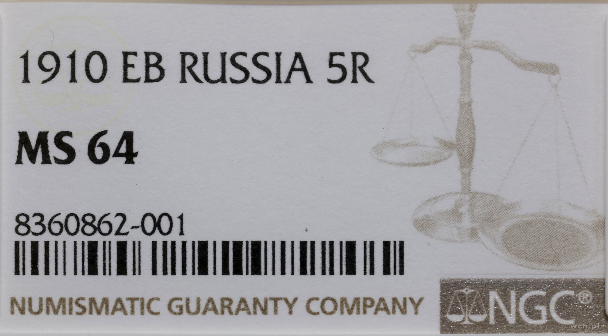 | Opis: | ROSJA / Mikołaj II (1894–1917). 5 rubli, 1910, Petersburg; Bitkin 36 (R), Fr. 180, Kazakov 377, Сидоров 4101, Uzdenikow 0356; złoto; bardzo rzadki rocznik, pięknie zachowana moneta w pudełku NGC 8360862-001 z oceną MS64. |