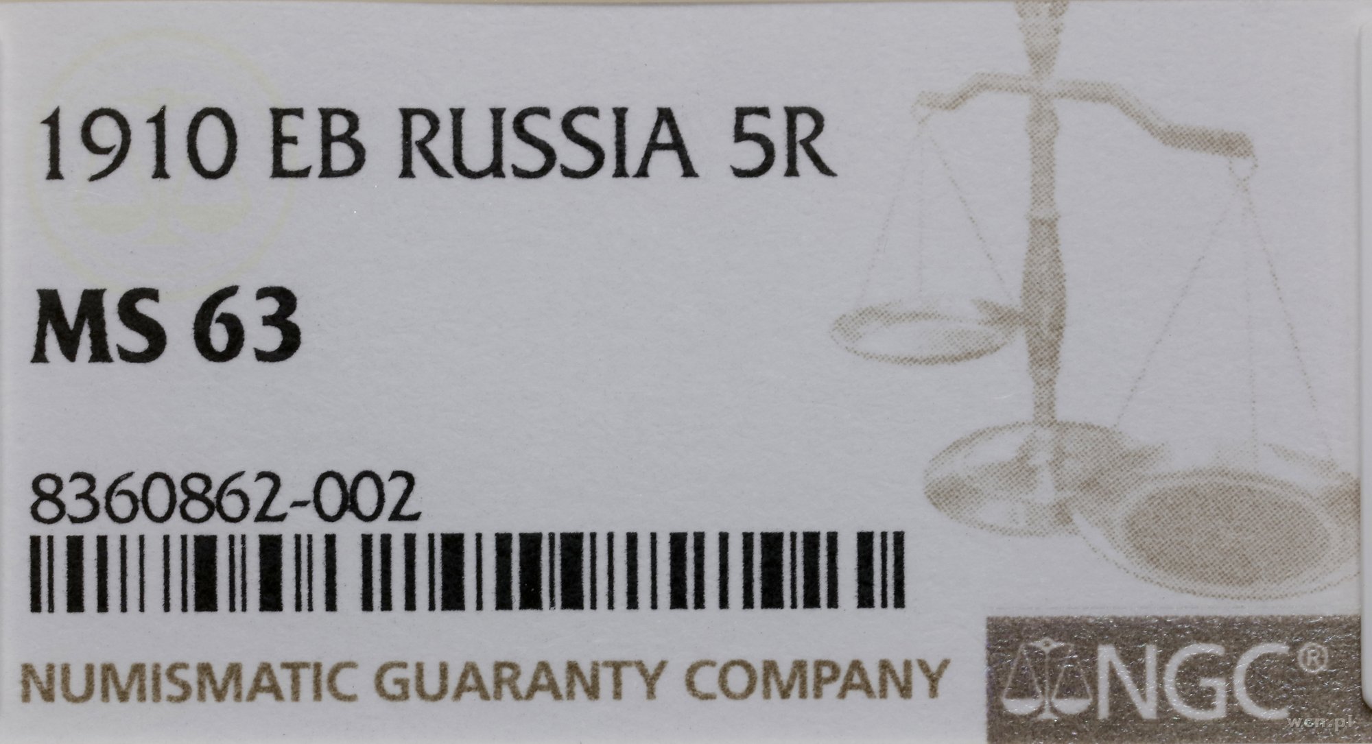 | Opis: | ROSJA / Mikołaj II (1894–1917). 5 rubli, 1910, Petersburg; Bitkin 36 (R), Fr. 180, Kazakov 377, Сидоров 4101, Uzdenikow 0356; złoto; bardzo rzadki rocznik, pięknie zachowana moneta w pudełku NGC 8360862-002 z oceną MS63. |