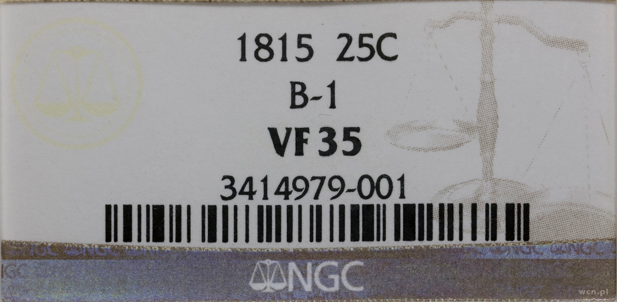 | Opis: | STANY ZJEDNOCZONE AMERYKI (USA). 25 centów, 1815, Filadelfia; typ Capped Bust; KM 44; rzadki rocznik, nakład tylko 89.235 sztuk, ciemna patyna, moneta w pudełku NGC 3414979-001 z oceną VF35. |
