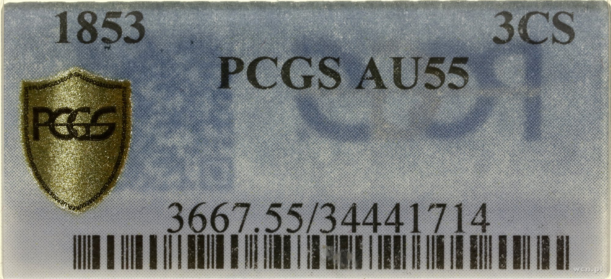 | Opis: | STANY ZJEDNOCZONE AMERYKI (USA). 3 centy, 1853, Filadelfia; KM 75; ładnie zachowana moneta w pudełku PCGS 3667.55/34441714 z oceną AU55. |