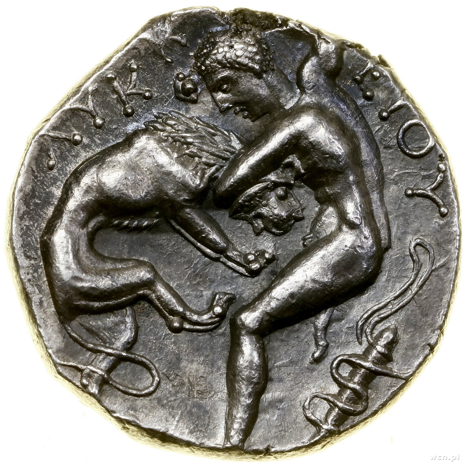 | 3 | Paionia / Lykkeios (356–335 pne) Tetradrachma, (ok. 350 pne); Aw: W obwódce perełkowej głowa brodatego Zeusa w prawo; Rw: Nagi młody Herakles walczący z lwem nemejskim, po prawej łuk i kołczan, u gór.. |