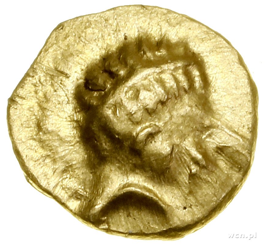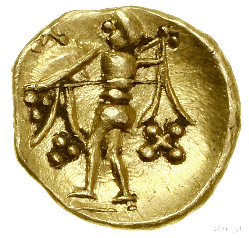 | 6 | CELTOWIE / Bojowie Stater typu Muschel, (ok. i w. pne); Aw: Wypukłość, na której wklęsłe koło; Rw: Półksiężyc, nad nim kropki i nitkowate promienie; Paulsen 390–392, Slg. Lanz 53 - podo.. |