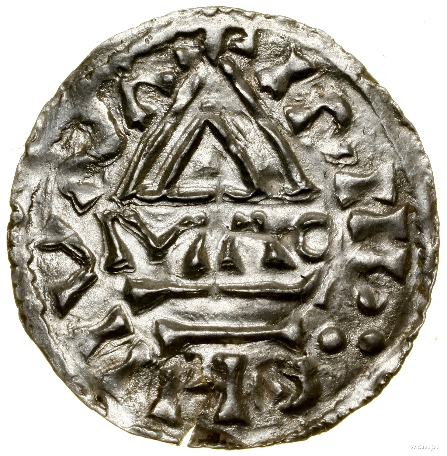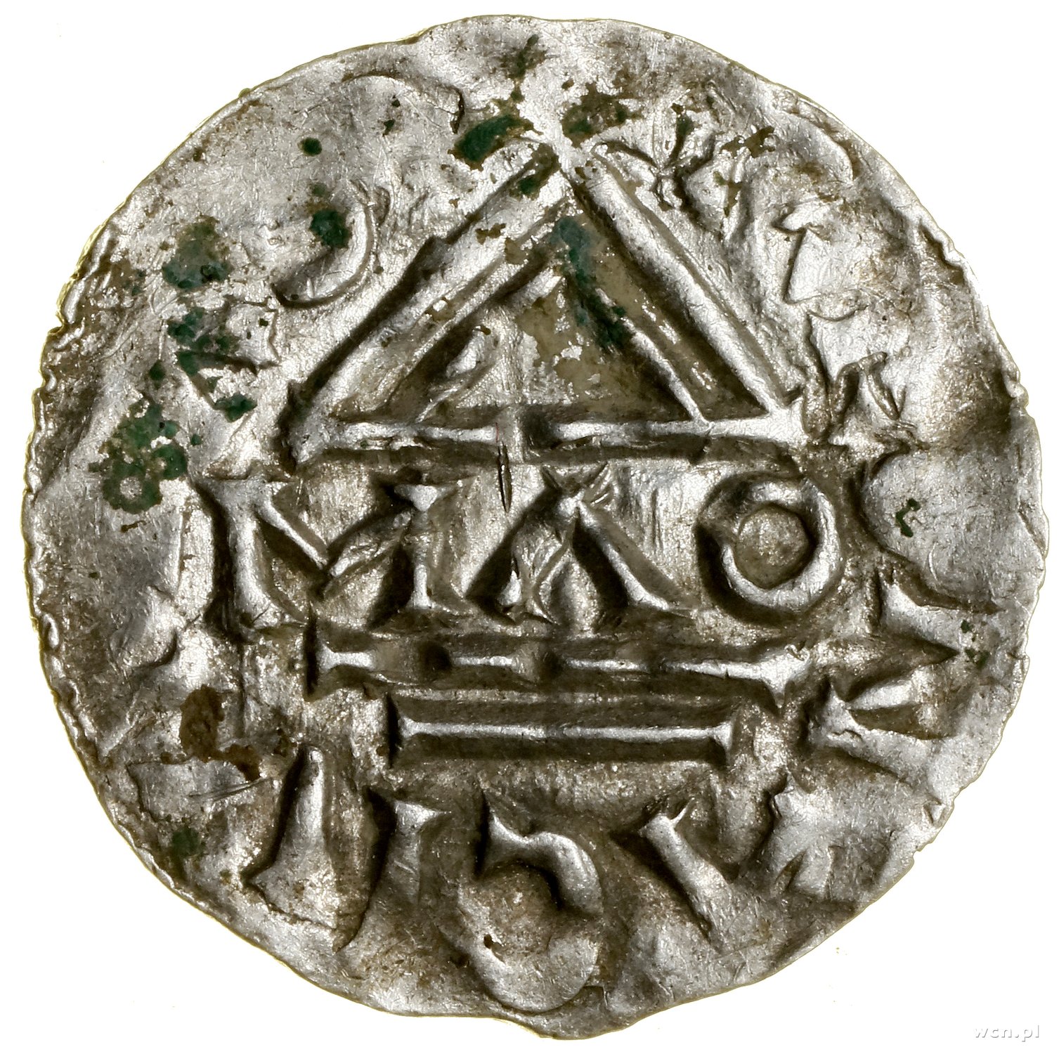 | 44 | ks. Henryk II Kłótnik (955–976 / 985–995) / II panowanie (985–995) Denar, (985–995), Ratyzbona, mincerz Mauro; Aw: Krzyż, w kątach kulka, pusto, kulka i pierścień, • HINDICVDSVX; Rw: Dach kaplicy, niżej MΛO, IRIII ⸫ CHIIVSΛ; Hahn 22f.. |