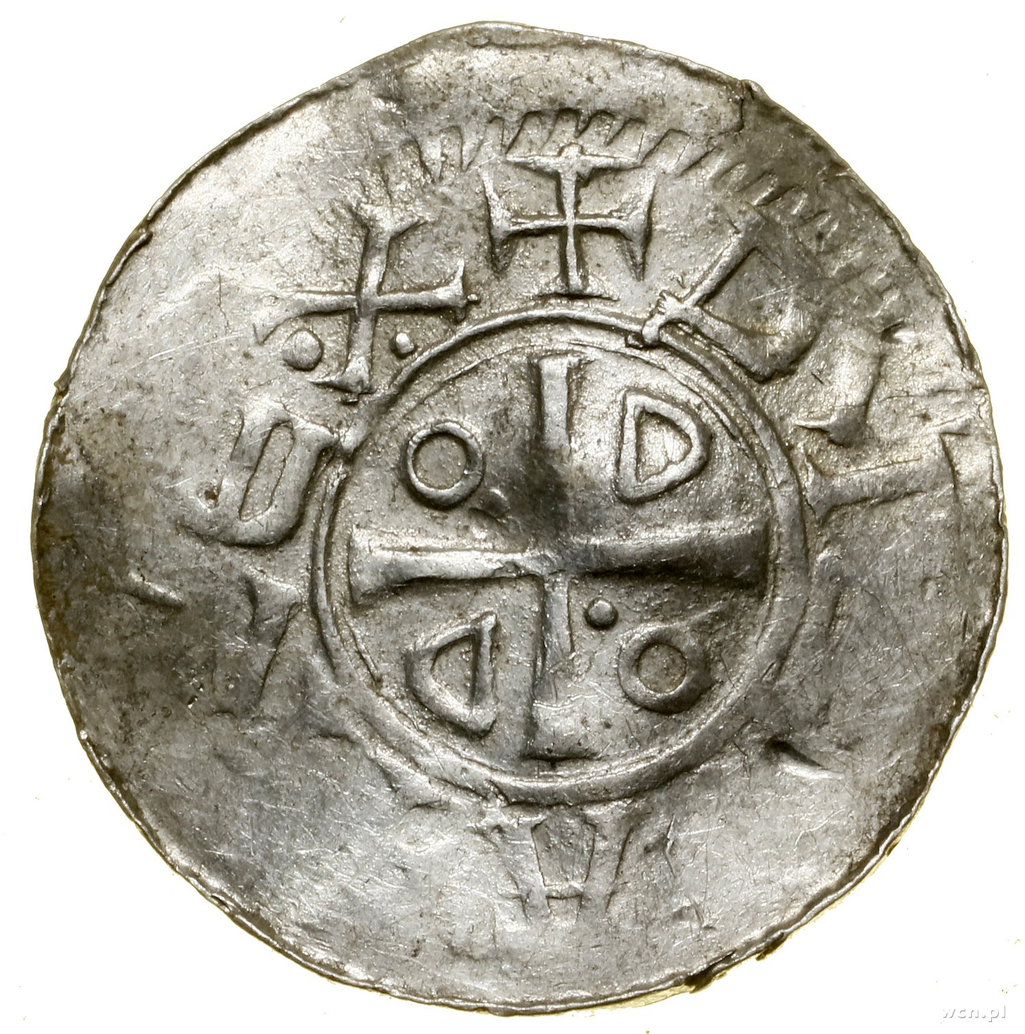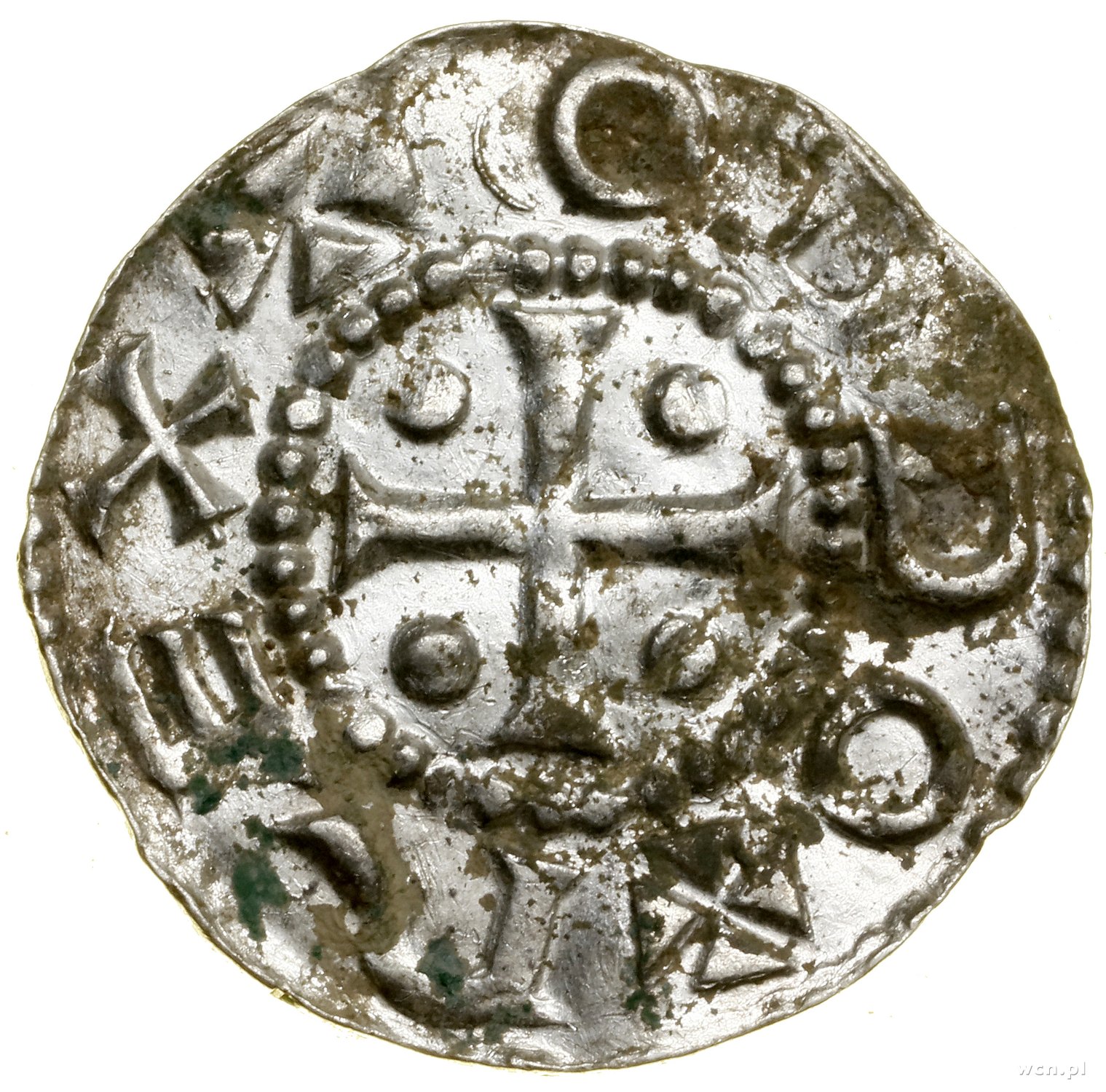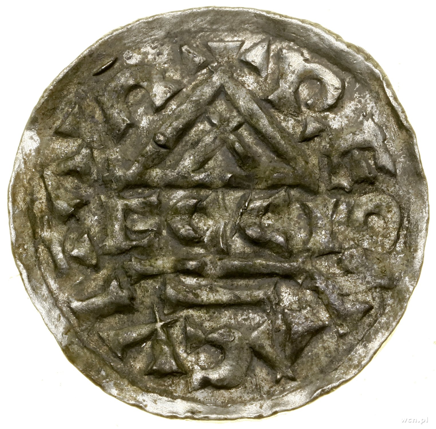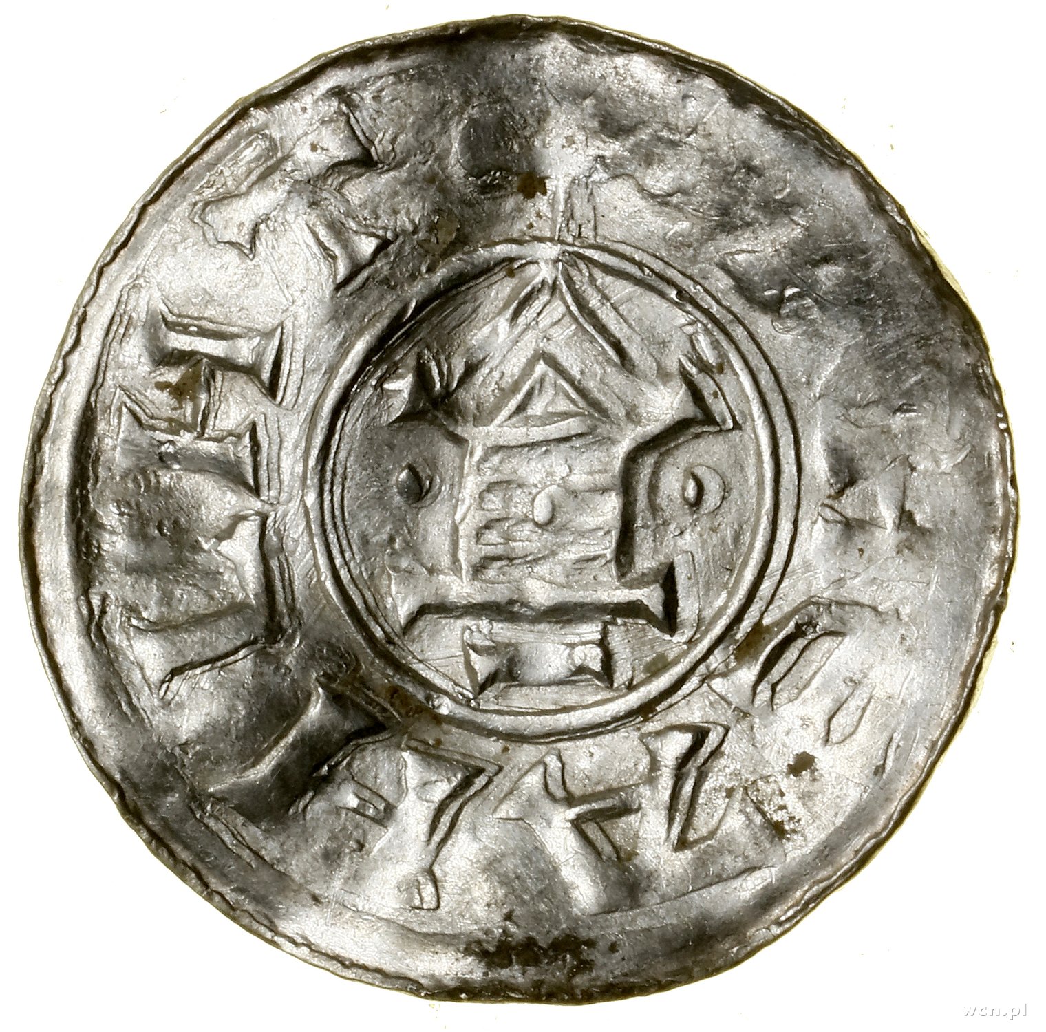 | 43 | ks. Henryk II Kłótnik (955–976 / 985–995) / II panowanie (985–995) Denar, (985–995), Ratyzbona, mincerz Ag; Aw: Krzyż, w kątach mała kulka, kulka, pierścień i kulka, • HENRICVS DVX; Rw: Dach kaplicy, niżej ECCI, REONΛ CVITΛS; Hahn 22.. |