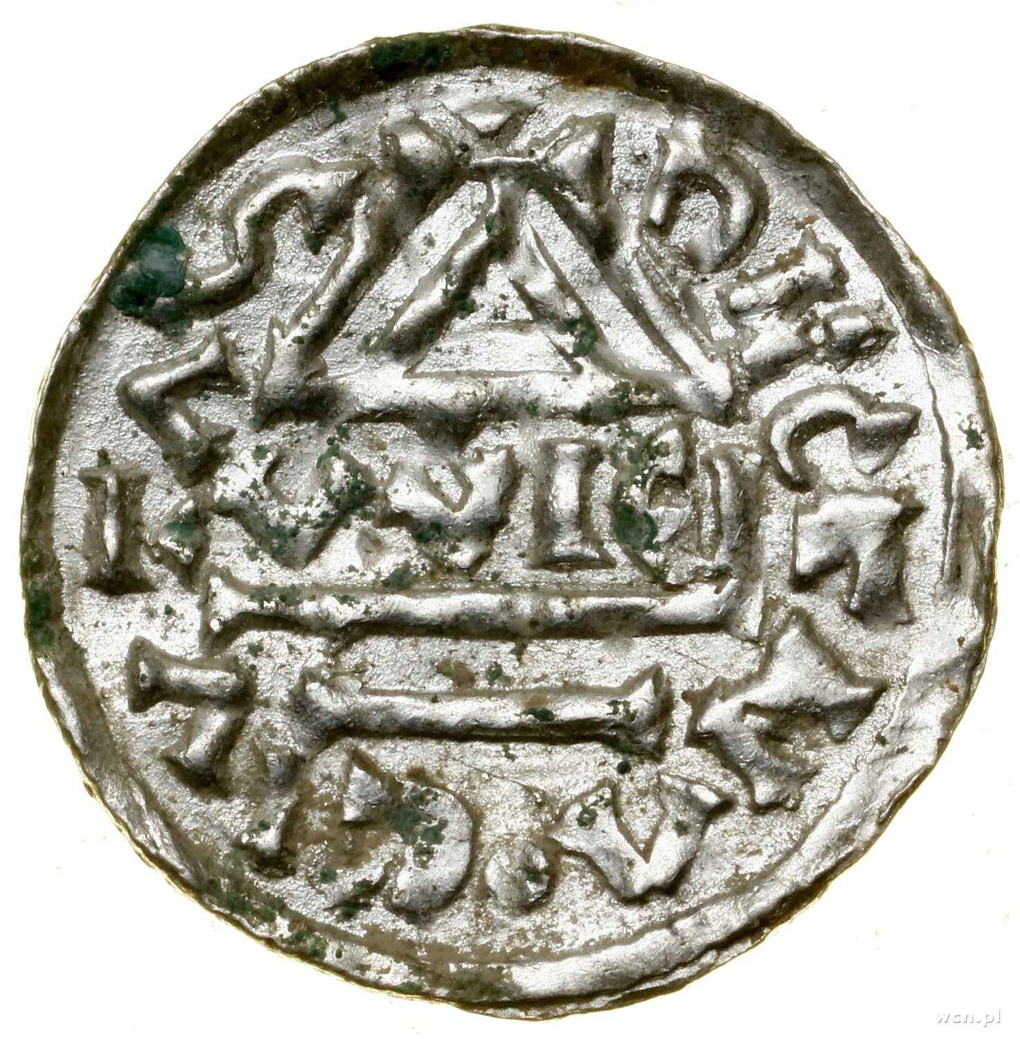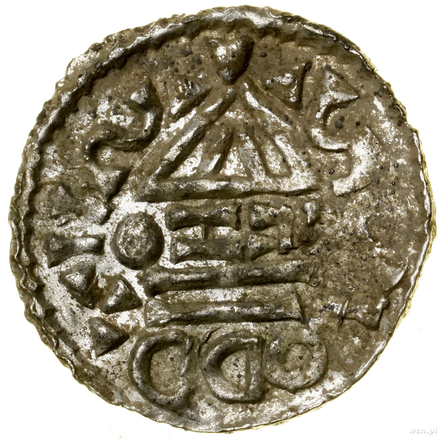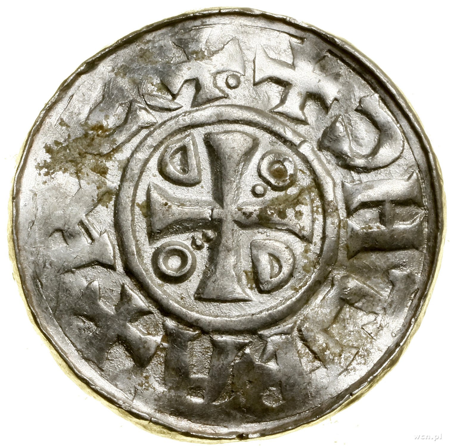 | 43 | ks. Henryk II Kłótnik (955–976 / 985–995) / II panowanie (985–995) Denar, (985–995), Ratyzbona, mincerz Ag; Aw: Krzyż, w kątach mała kulka, kulka, pierścień i kulka, • HENRICVS DVX; Rw: Dach kaplicy, niżej ECCI, REONΛ CVITΛS; Hahn 22.. |