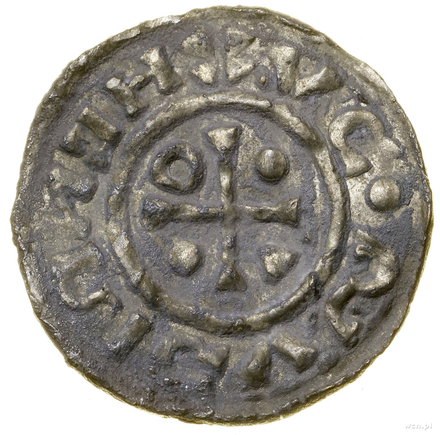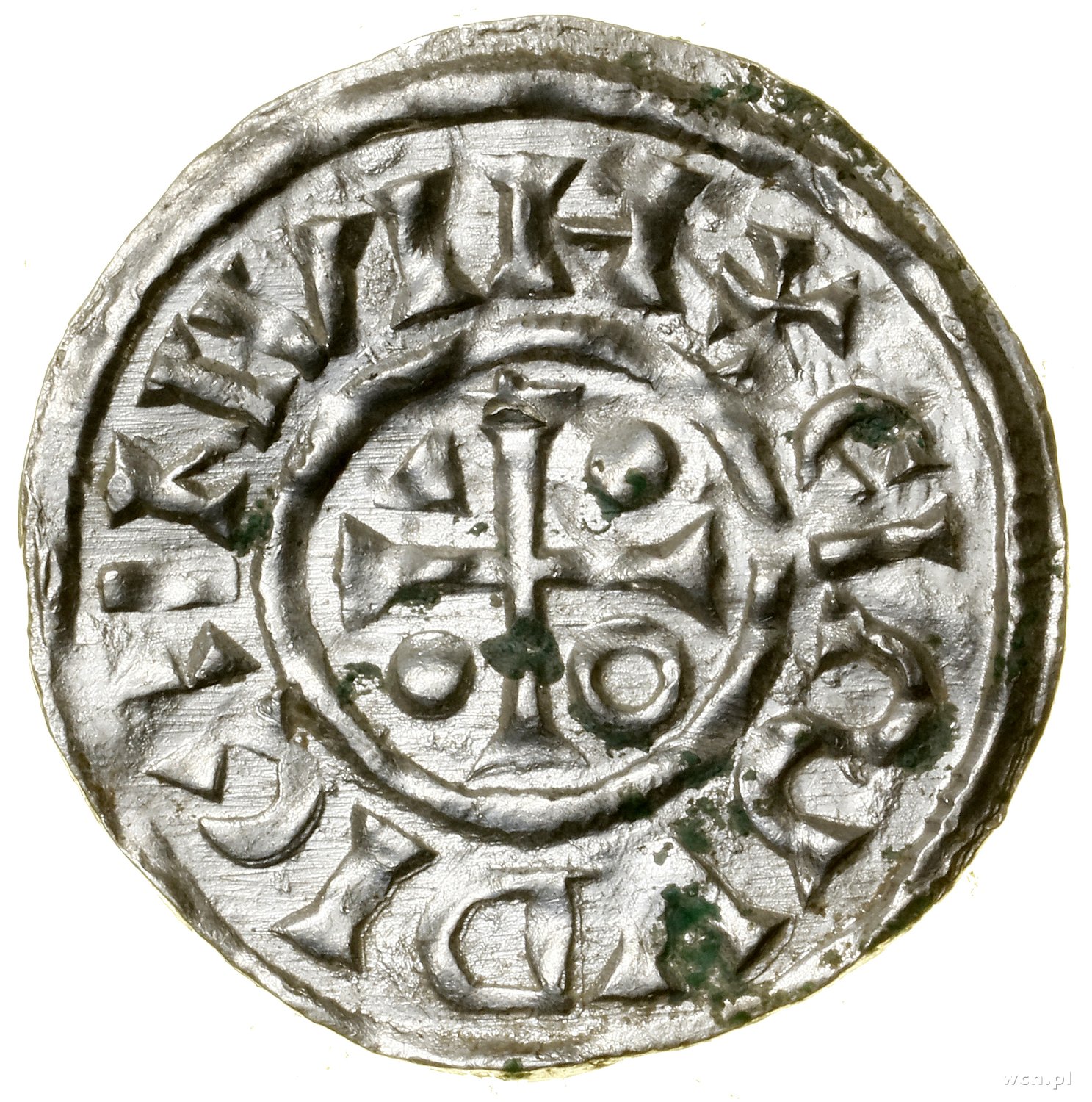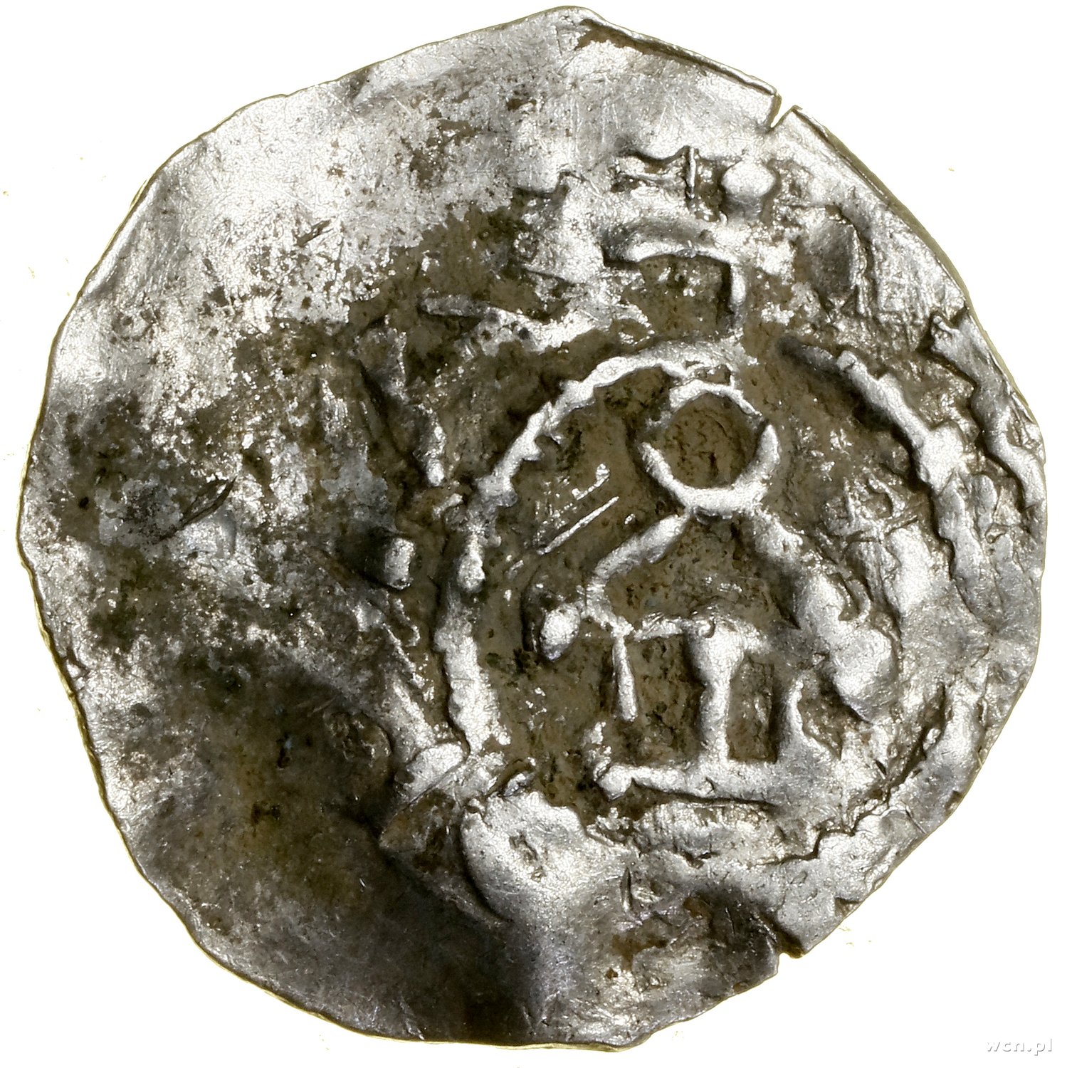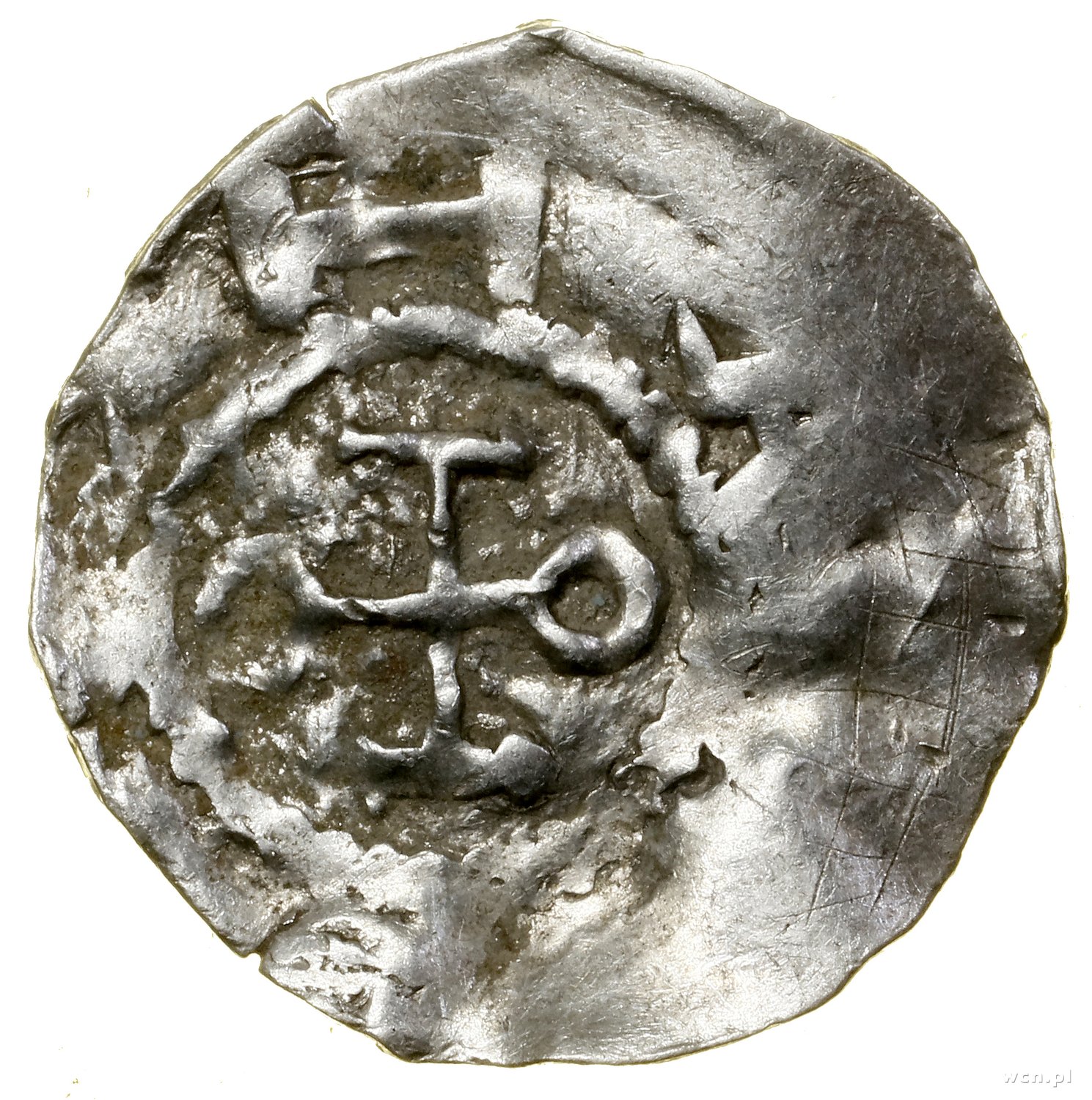 | 43 | ks. Henryk II Kłótnik (955–976 / 985–995) / II panowanie (985–995) Denar, (985–995), Ratyzbona, mincerz Ag; Aw: Krzyż, w kątach mała kulka, kulka, pierścień i kulka, • HENRICVS DVX; Rw: Dach kaplicy, niżej ECCI, REONΛ CVITΛS; Hahn 22.. |