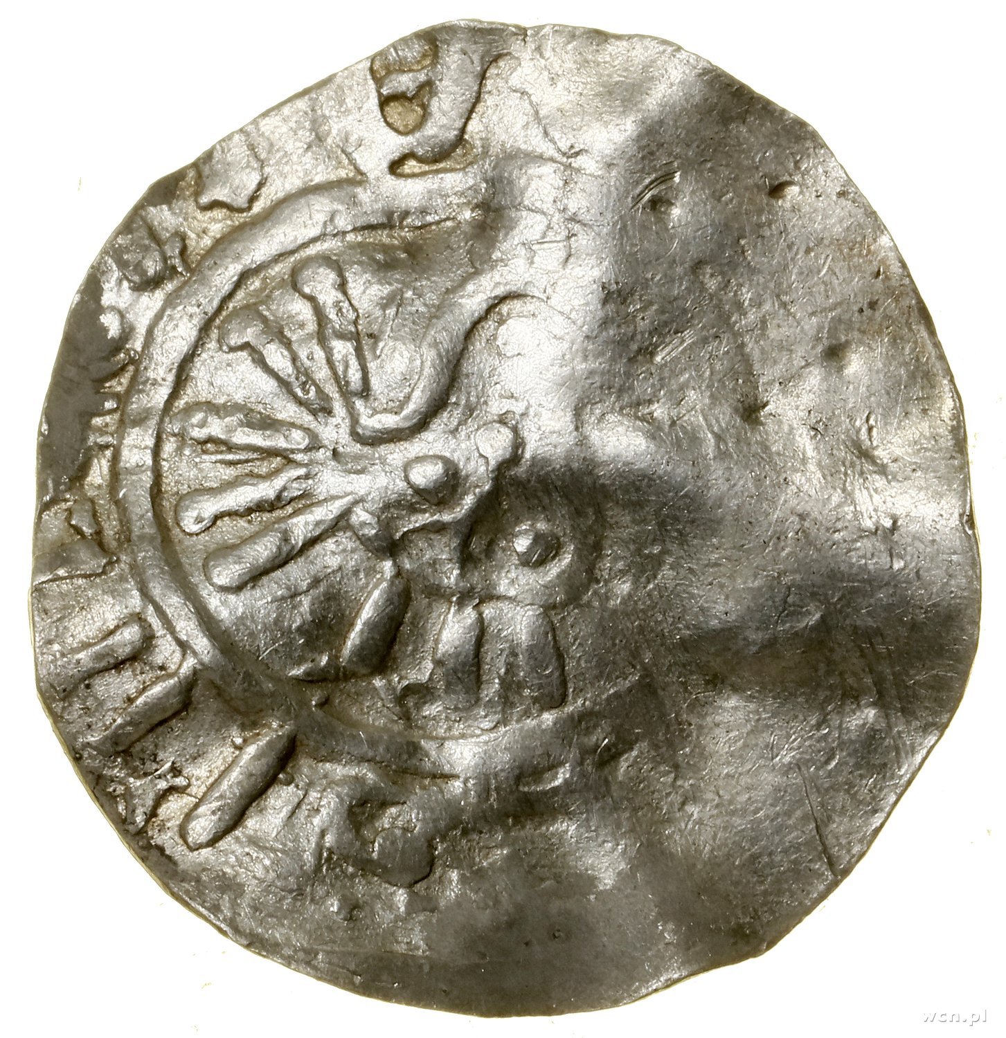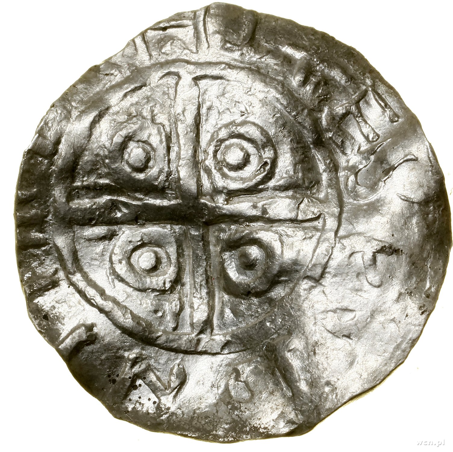 | 63 | POLSKA / Bolesław Chrobry (992–1025) Denar czeski (naśladownictwo denara bawarskiego), (po 1002); Aw: Krzyż grecki z rozszerzonymi końcami ramion, w kątach klin, trzy kulki, klin i pierścień z kulką, leg.. |